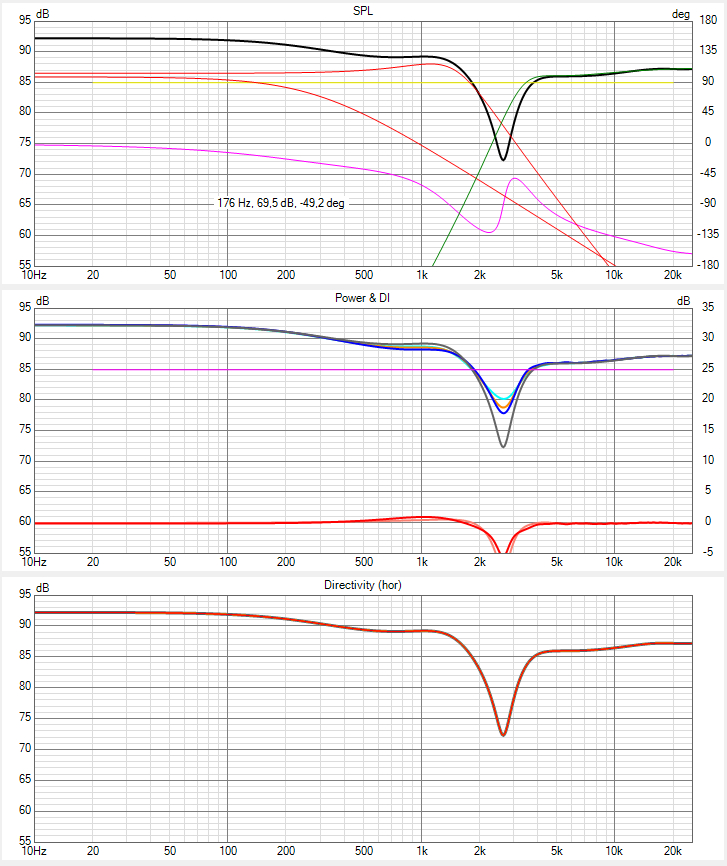 Я правда активное сопротивление катушки на ВЧ не менял - не знаю каким оно будет, поэтому оставил как и раньше. Еще в противофазе пищалку включил. График SPL вроде и ничего, но это всего лишь график. Надо будет попробовать собрать на макете и послушать.