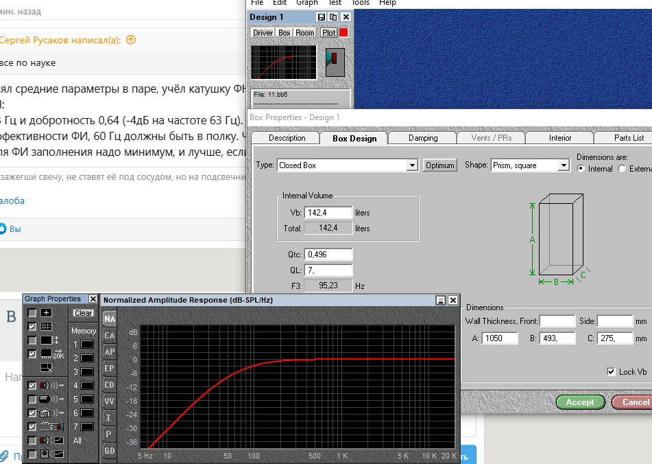 Удивляет конечно..почему расчетных 50 Гц нет..Объем чистый колонки 138 литров, моделируешь Боксе рисует полку от 50...а по факту увы (хотя звучит внушительно..тело шевелит).