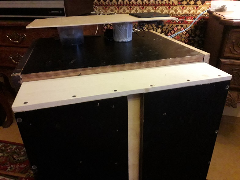 Ничего особо замудрёного. Один ящик вставляется в другой. Уплотнителем в зазоре временно назначена фланель из неликвидов, позже сделаю что-нибудь более износоустойчивое.