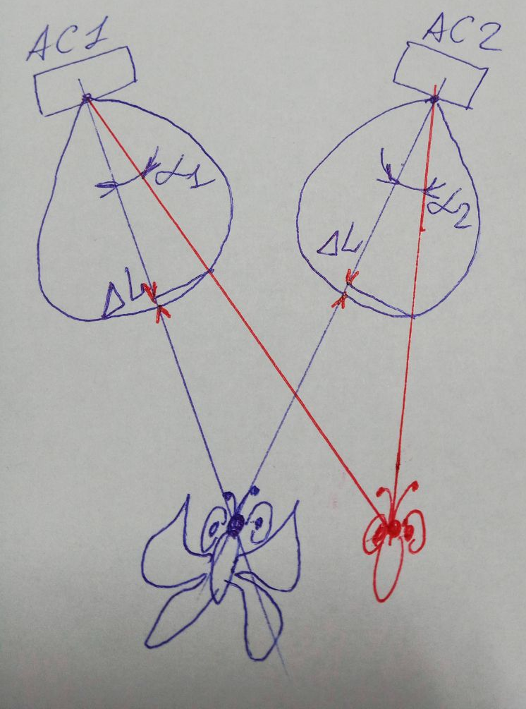 Теперь разверните АС от бабочки, (типа, чтобы стульчик стал шире), и Вы увидите, что теперь дельта альфы - разного знака, дельта эли - разного знака, а расстояния изменяются как в первом случае. В первом приближении, если главенствует ДН, то стульчик будет во втором случае гораздо короче!