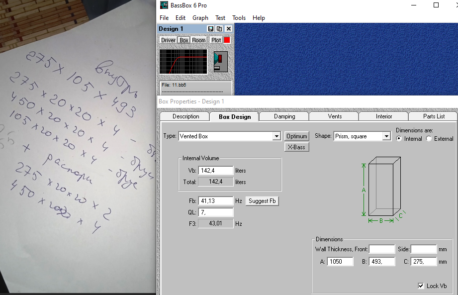 не..все по науке :)..единственное отступление - нет трубы..только отверстие 114 мм и толщина фронт панели 18 мм без учета брусков и распорок - 142 литра..за вычетом - 138 (внутренние размеры 1050х493х275)