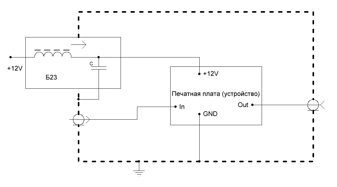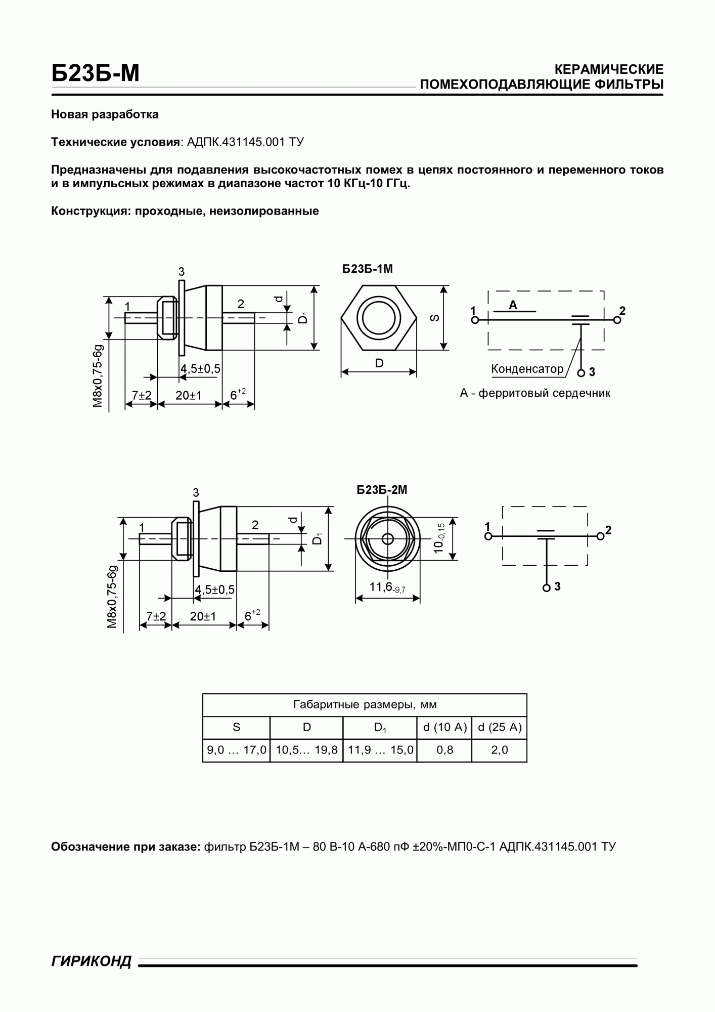Фильтры Б23Б в отличии от проходных конденсаторов имеют в составе ферритовую трубку, образующую совместно с проходящим внутри неё проводником катушку индуктивности. В конструкции корпуса также размещен опорный керамический конденсатор, одна обкладка которого выполнена в виде металлической резьбы на корпусе с накрученной гайкой, вторая обкладка подсоединена на выход фильтра после катушки индуктивности. Направление включения фильтра указано стрелкой нанесенной на корпус рядом с маркировкой. Фильтр крепится на шасси (экран) гайкой, питание подается на вывод согласно стрелки, снимается питание на схему с противоположного вывода. Используется в высокочастотной и измерительной аппаратуре.