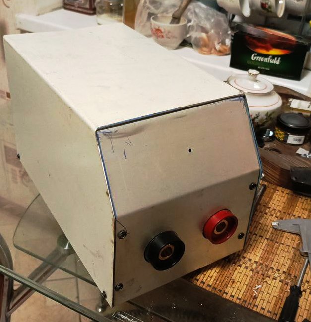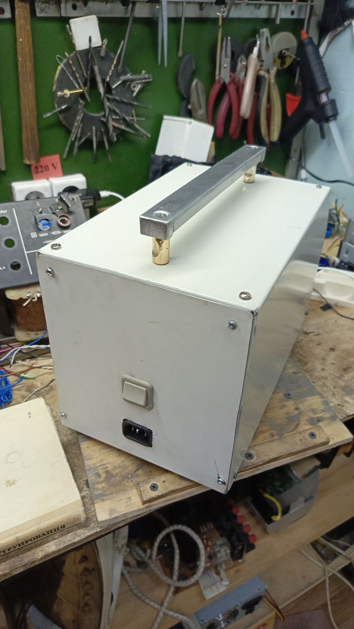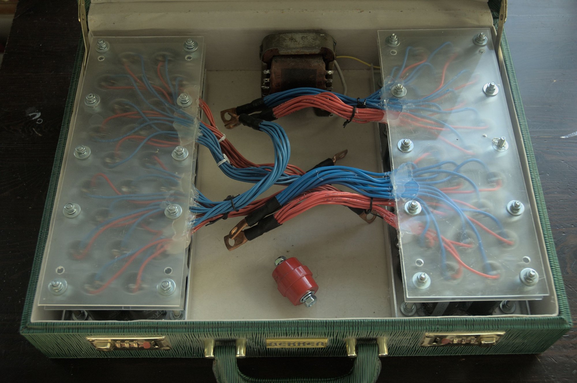 Такой чемоданчик от набора столовых приборов послужит корпусом. Вот так в него входят батареи конденсаторов. Где-то тут же виден и трансформатор.