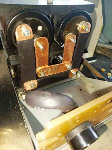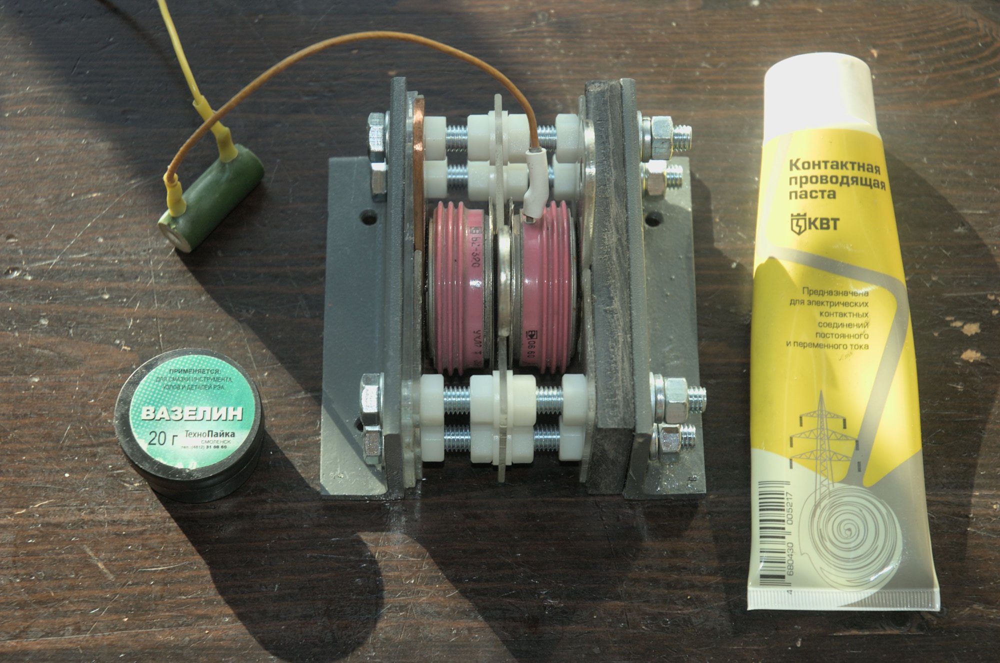 "Коммутатор" - всё это веселье чтобы не дать деталям сместиться. Прозрачные пластиковые прокладки с вырезами под шины. На втором фото присутствуют средства для предотвращения искр и улучшения контакта - обычные для электротехники.