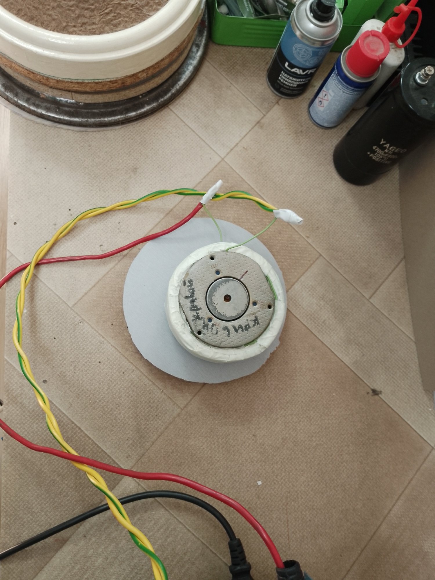 Потом взял магнит от пищалки Alphard TW-318. Вот на нём я впервые увидел наглядно, что всё работает. Сама МС бодро подскочила в индукторе.