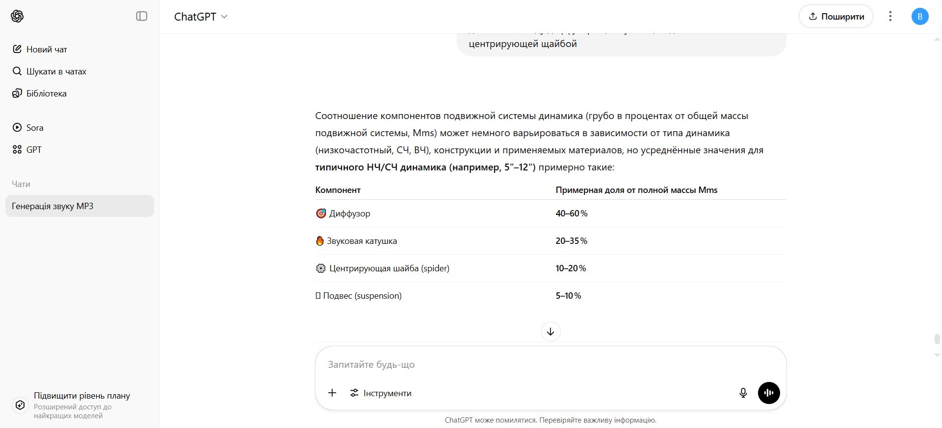 Тут подвес 20 гр. (шайбу пока не будем упоминать), в Mms от него половина. В "измерениях" обсуждаемого динамика Mms на 10 гр. меньше, т.е. тот кто так считает думает что подвес вообще неподвижен. А если принять соотношение из скриншота выше, где диффузор в 4 раза тяжелее подвеса, то выходит что подвес не только не участвует в Mms, но и прихватывает с собой в неподвижность ещё и часть диффузора и это откровенный абсурд.
