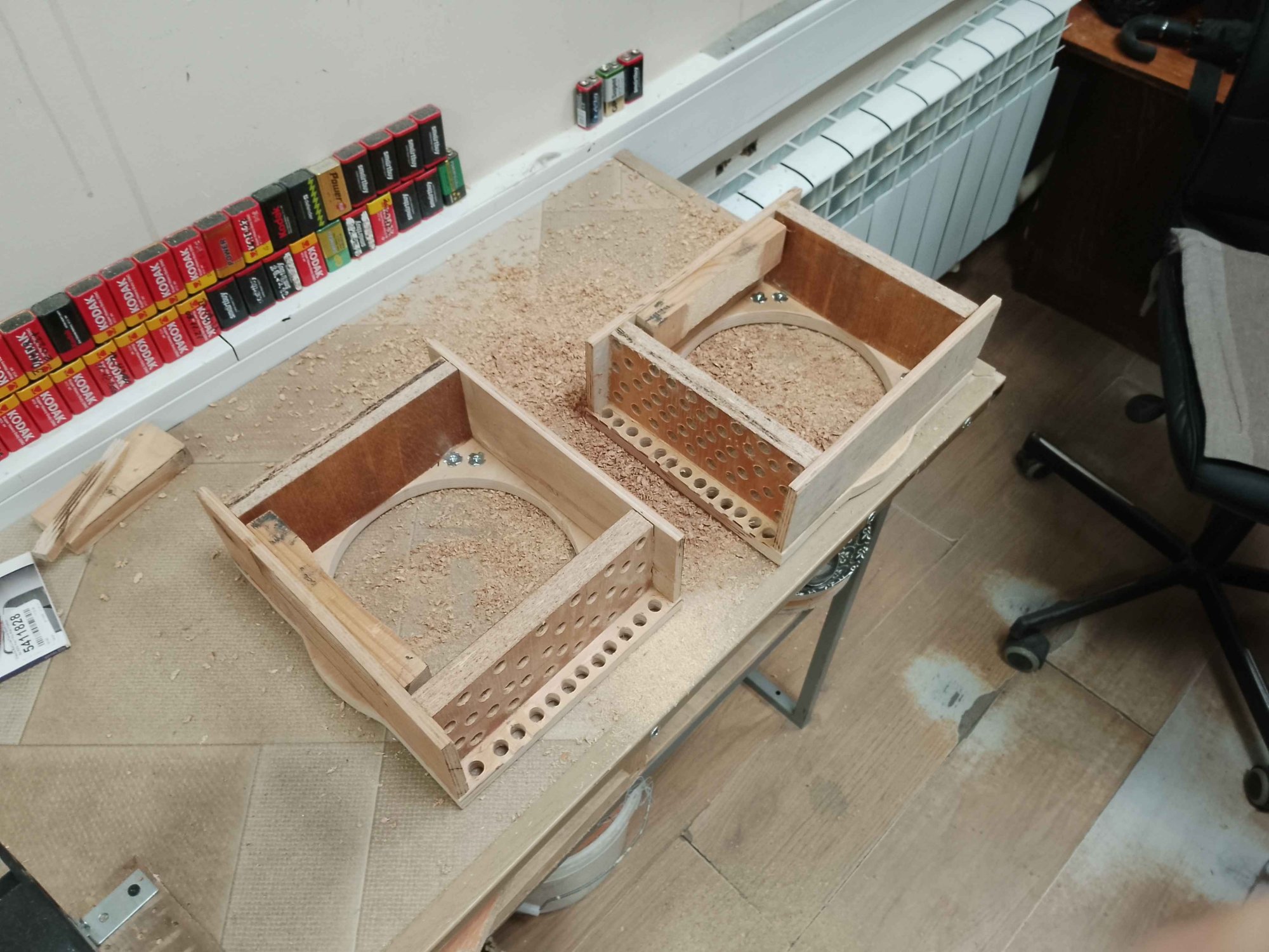 К тому же на боковых стенках короба отверстия не сквозные. Дсп, что использовал - толщиной 20мм, ещё и лакированные, насверлил лунок пусть теряются там заблудшие отражения.