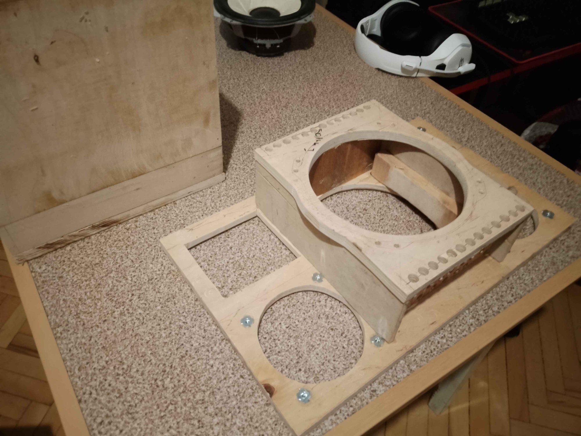 Надо ещё теперь придумывать как крепить вч динамики, думал просто винтами с гайками врезанными в дерево - как сделала под остальные динамики, но промахнулся с расстоянием отверстий на алюминиевой пластине, сделал их слишком близко к самому корпусу пищалки, и на таком расстоянии врезать гайки в переднюю панель не выйдет(