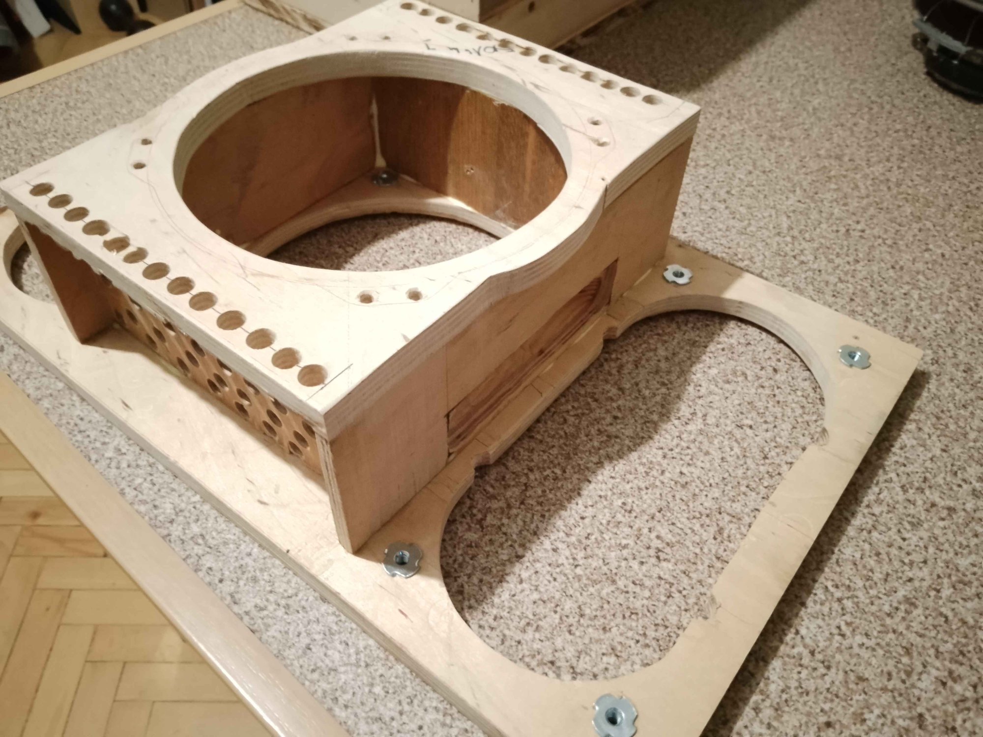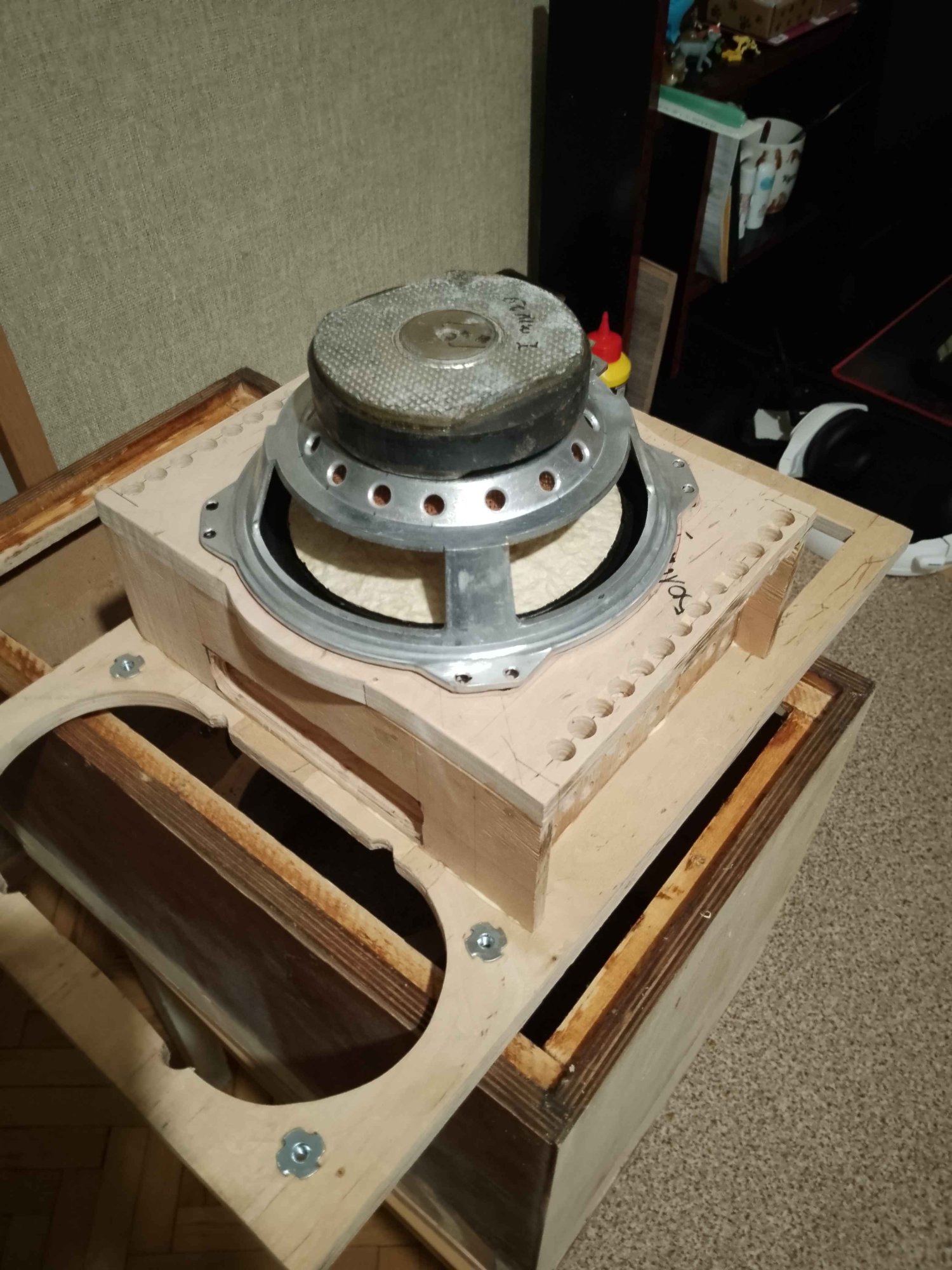 Нахлобучка с дырочками - это промежуточный объём между двух нч динамиков. По задумке будет изобарная конструкция, то есть фронтальный нч не будет нагружен на объём короба напрямую, за ним будет тыловой нч - который в фазе с ним будет постоянное давление поддерживать. Что на деле получится - самому интересно.Что за нахлобучка с дырочками сзади у НЧ дина. По теме в ТЗ вроде не упоминалось или я что то пропустил.