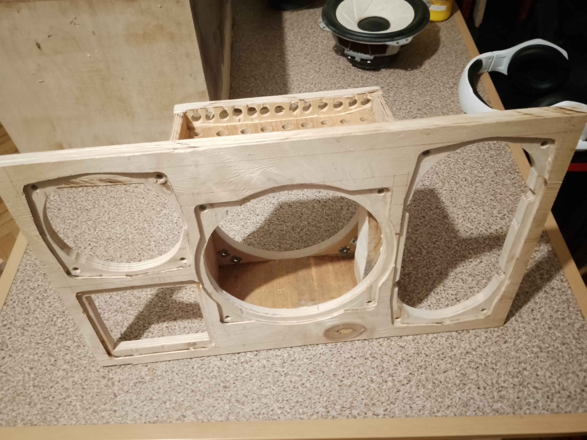 Сама конструкция жёсткости передней панели придаёт очень существенно, а с учётом больших отверстий под динамики и небольшой толщины панели - это очень кстати. Так же этот дополнительный короб жёстко вклеется между боковых стенок и будет выполнять функцию распорки, а то боковины сейчас очень звонкие.