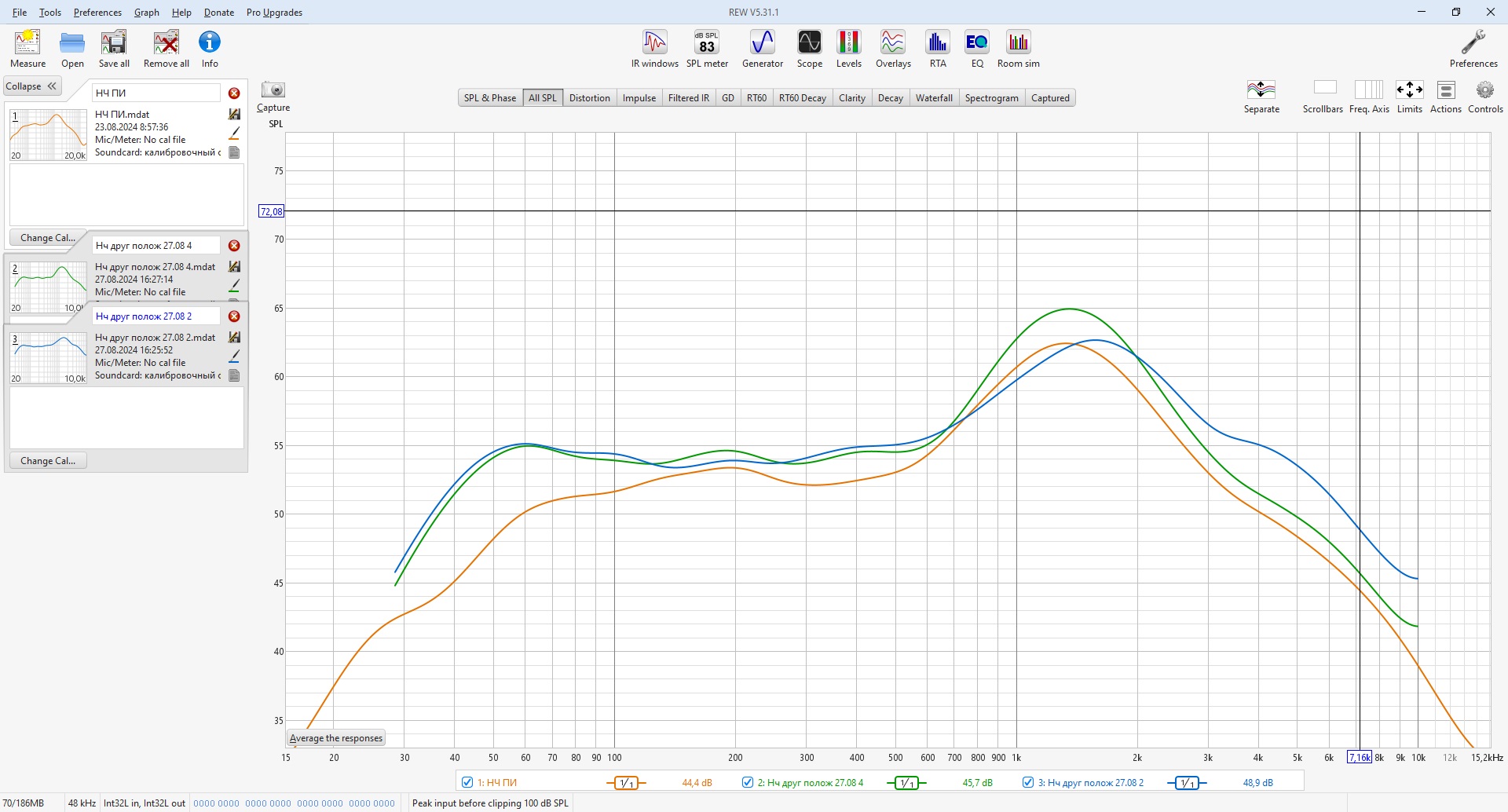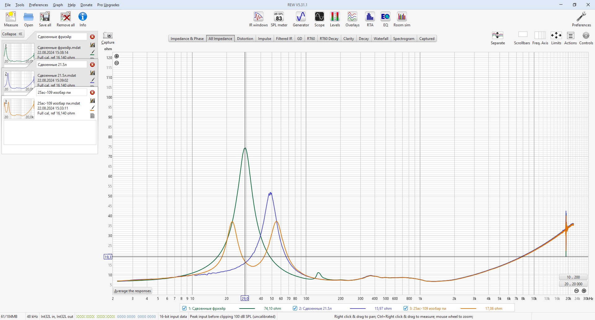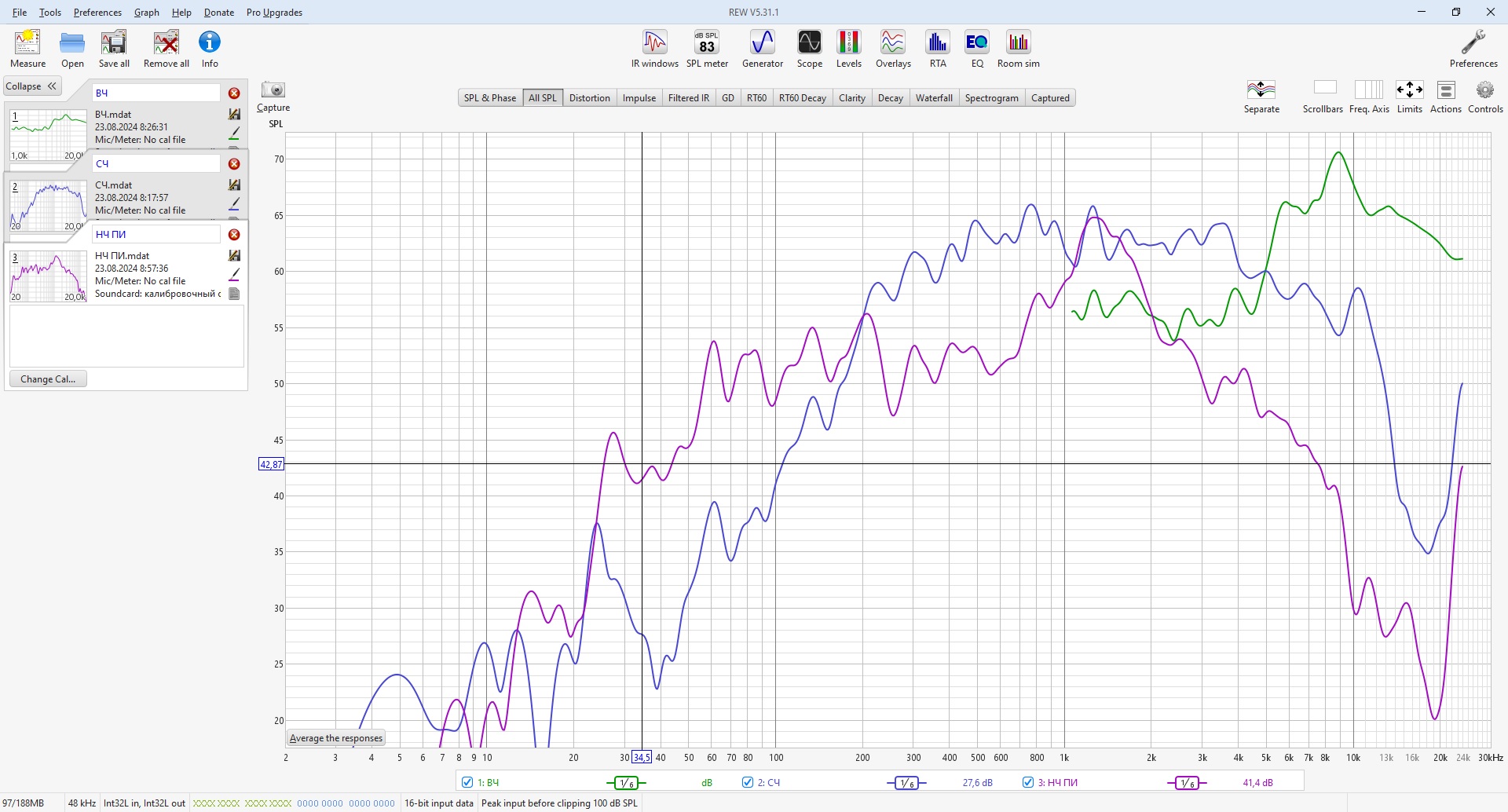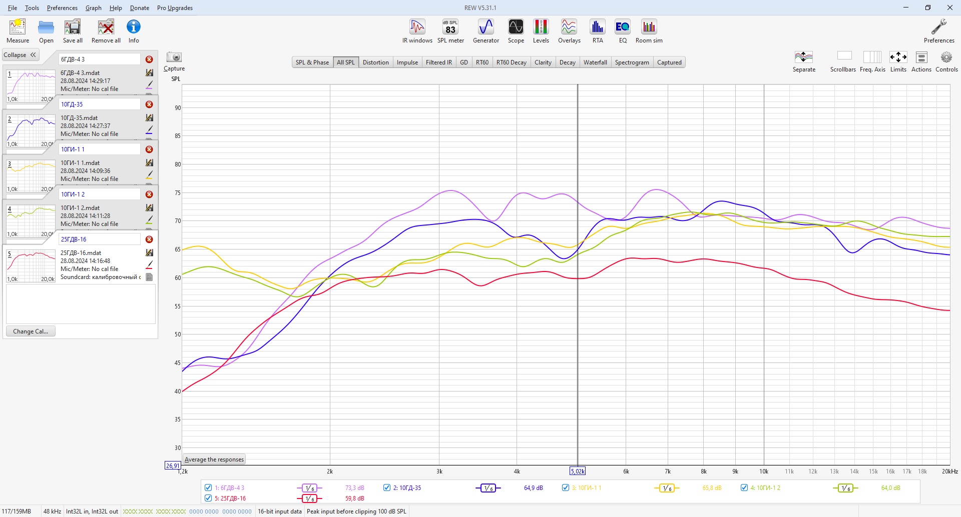 Итак. Зря Вы снимали НЧ (и СЧ) полосу без поглотителя и в 1/6 октавы, нахватались помех вместо звука.