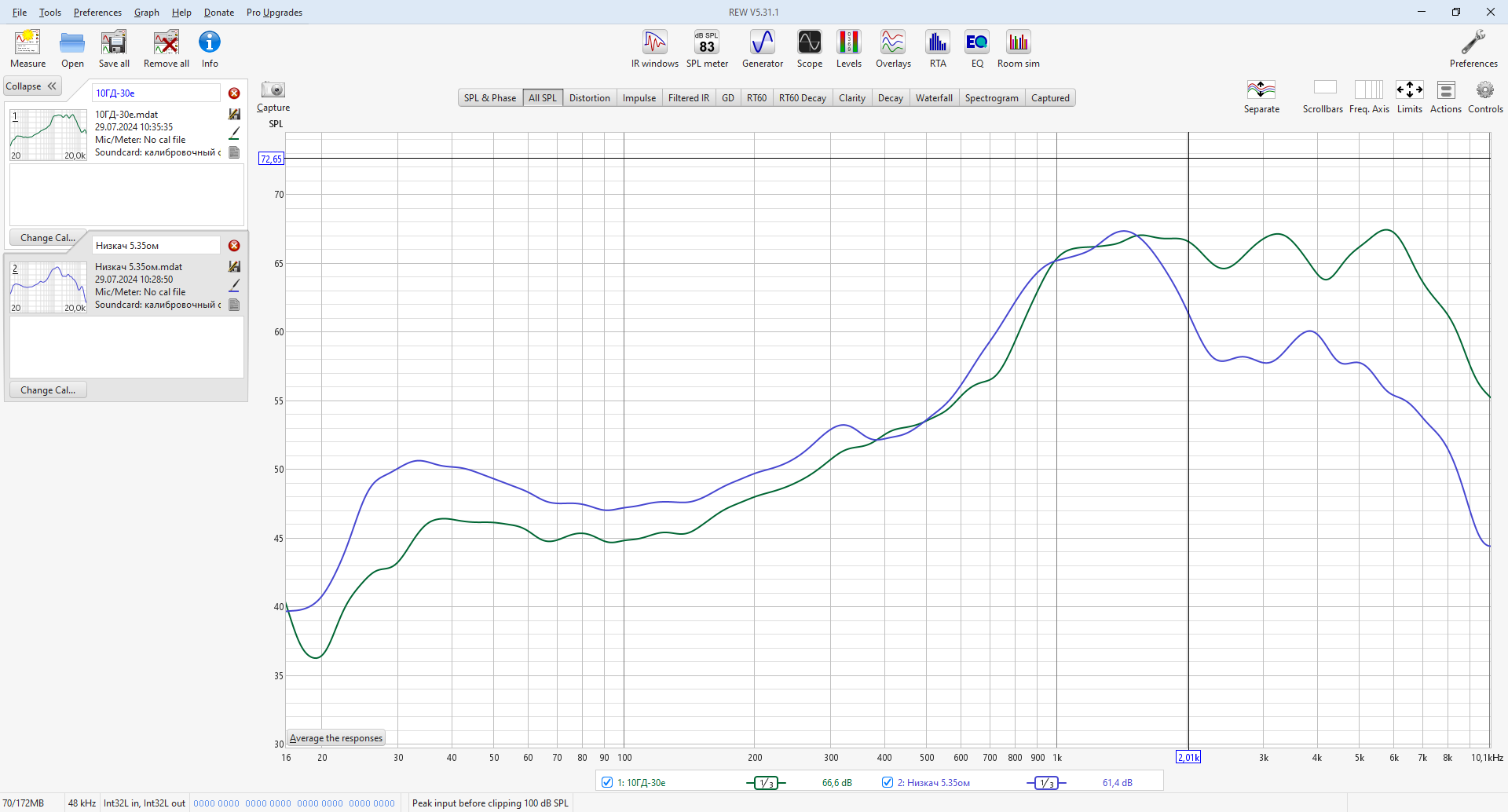 поведение на нижнем срезе смотрим в упор к динамику. На метре - смотрим АЧХ динамика в оформлении, с комнатными бяками, куда без них.