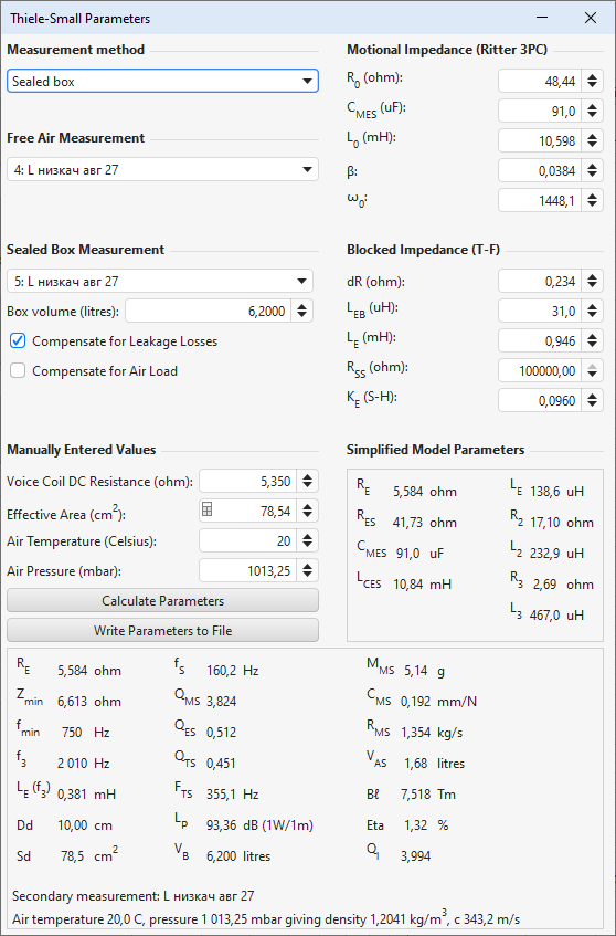 НЧ динамик что самодельный с своим диффузором, вы излишне мягкой подвижкой заточили под ЗЯ, его параметры (низкий резонанс/большой экв./низкий БЛ) говорит о том что мотор слишком слабый, а гибкость слишком большая. По прямому назначению в ПИ не заработает, во первых гул, и не контролированные колебания головки.