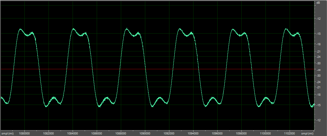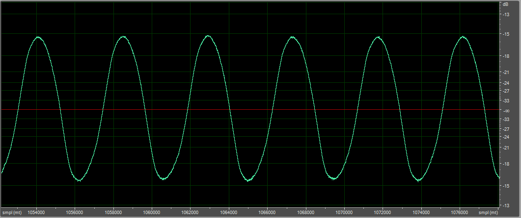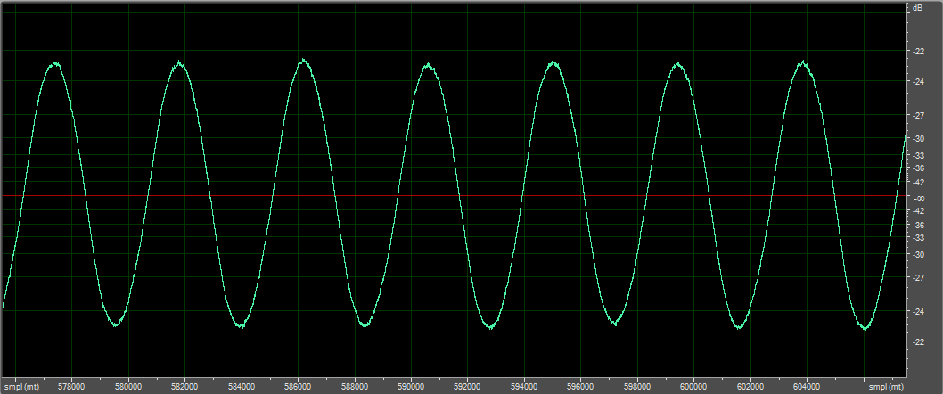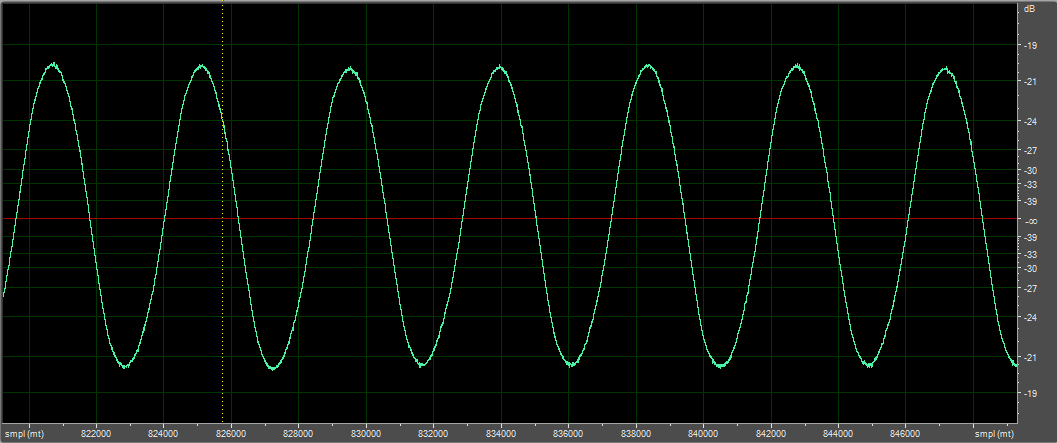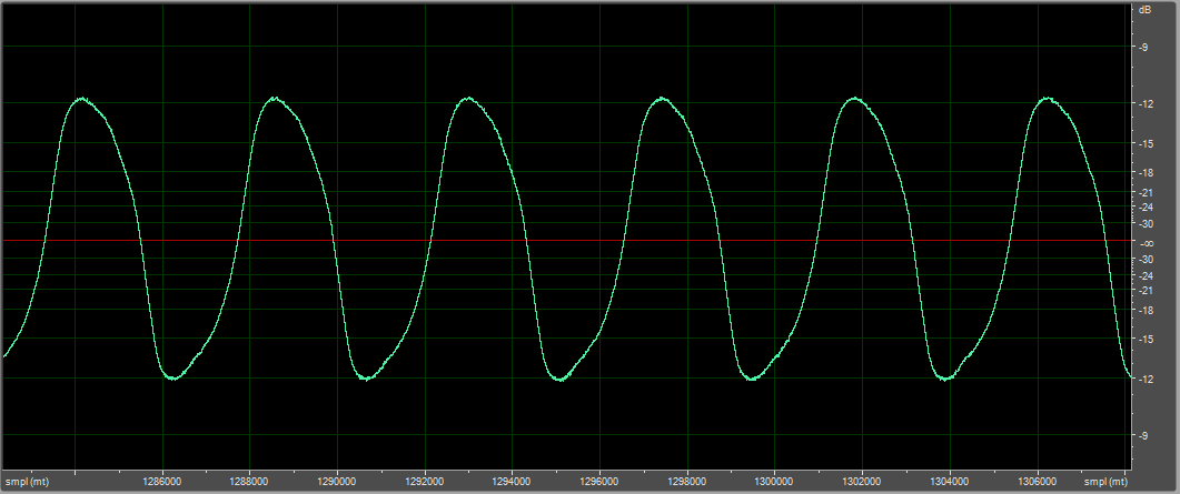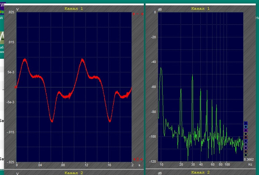 В воздухе, синус 10 Гц, D-усилитель, микрофон вблизи, пик-пик 3 мм (на глаз)