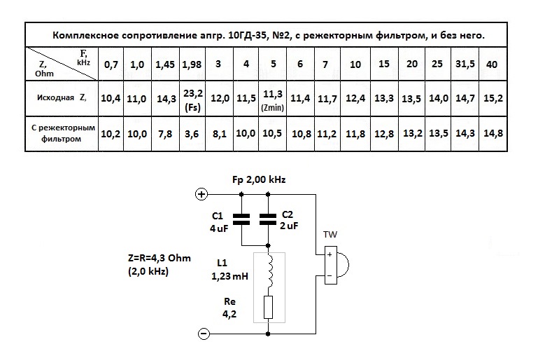 В точке резонанса 10ГД-35 (1850 Гц) реактивное сопротивление режектора 4,7 Ом.