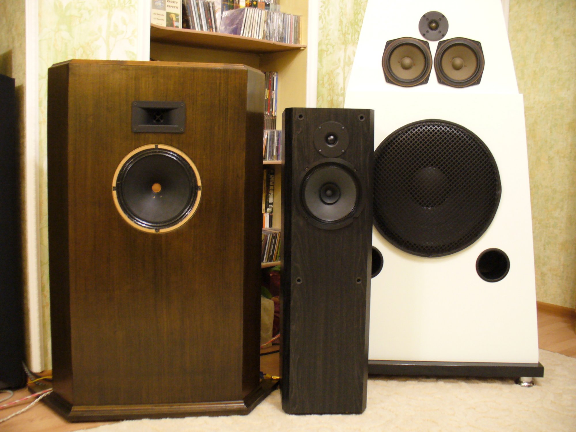 Недавно , получив возможность вновь повозиться с сочиненной давно тому назад трехполоске на 18" лопухе питерской выделки, перевел динамик на первый порядок. заметно увеличив катушку фильтра и выбросив конские емкости в обмен на цобеля. Средник тоже доработан, сделал ему пологий срез первого порядка, заркально басовику. Результат получился ошеломительный. Динамики слились по звучанию, бас ожил и задышал, стыковать пищалку оказалось парой пустяков. Итог- роскошно звучащая колонка. На фото она белого цвета, на втором плане .