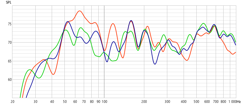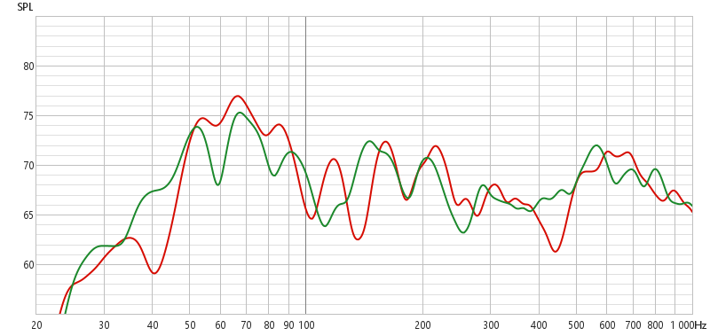 В целом, и тут идея работает: энергия, вкачанная в комнату уменьшается, АЧХ ниже 70 Гц - выравнивается (для красной кривой).