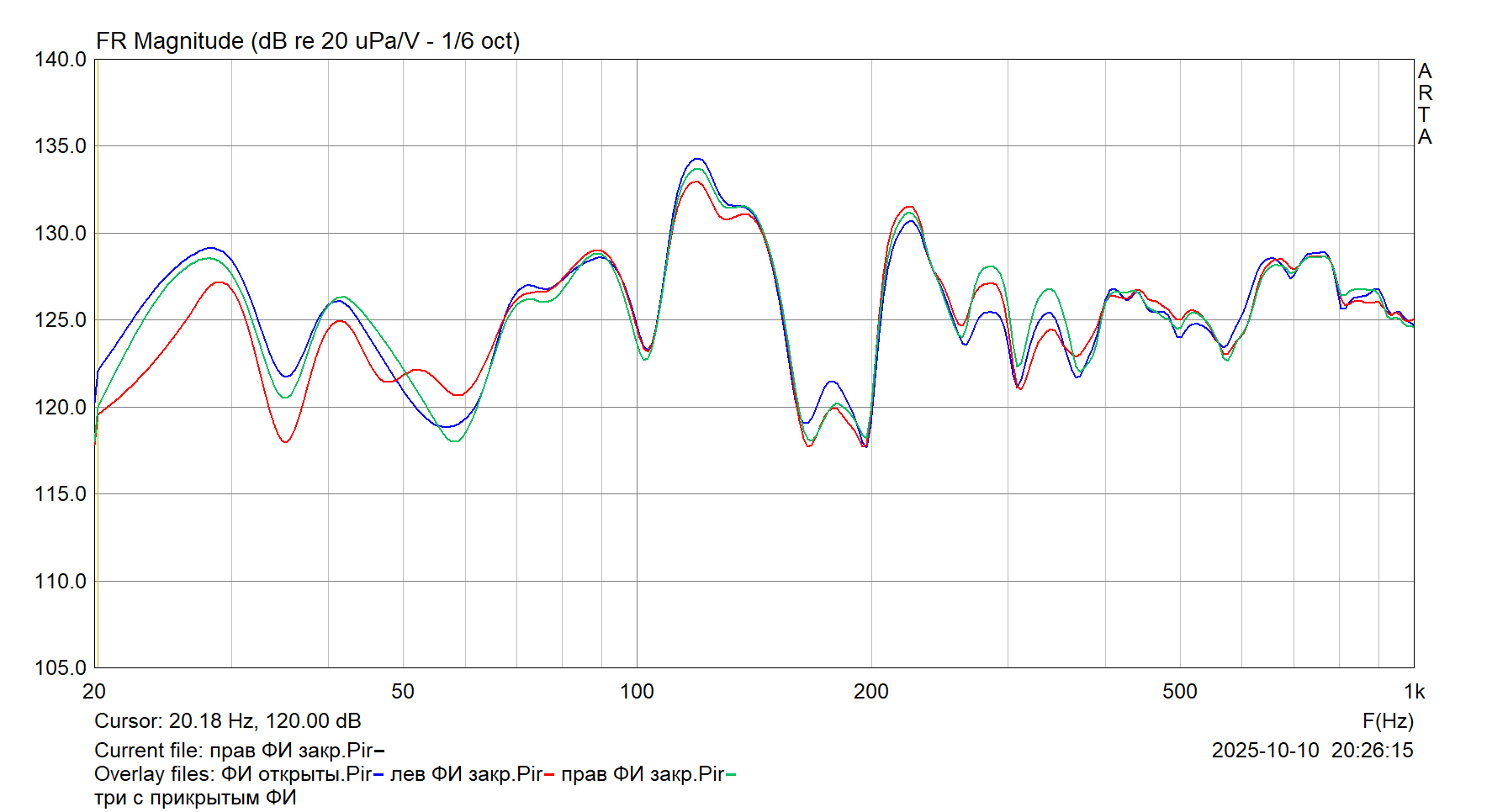 зелёная кривая - ФИ закрыт рукой, жёлтая - ФИ открыт), плюс саб-ЗЯ. И АС, и микрофон расположены симметрично относительно продольной оси КДП (саб - возле левой АС динамиком в пол), но личные АЧХ АС всё равно сильно отличаются на НЧ/мидбасе!