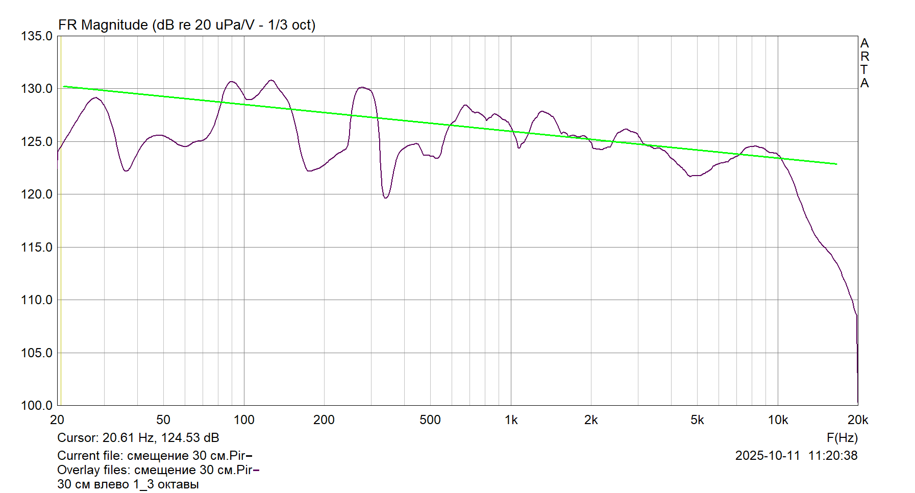 Попросил человека сместить микрофон от оси влево на 30 см, левая АС для симметрии отодвинулась назад также на 30 см. Получили красную кривую (оба ФИ открыты в обоих случаях):