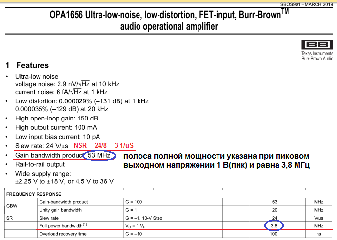 Такая широкая полоса пропускания и скорость характерны для усилителей с токовой обратной связью (CFA-current feedback amp.), однако если полосу пропускания необходимо ограничить, этого всегда можно добиться добавив простой RC-фильтр на вход усилителя (фильтр нижних частот=low pass filter),что является обычной практикой для многих аудиоусилителей,