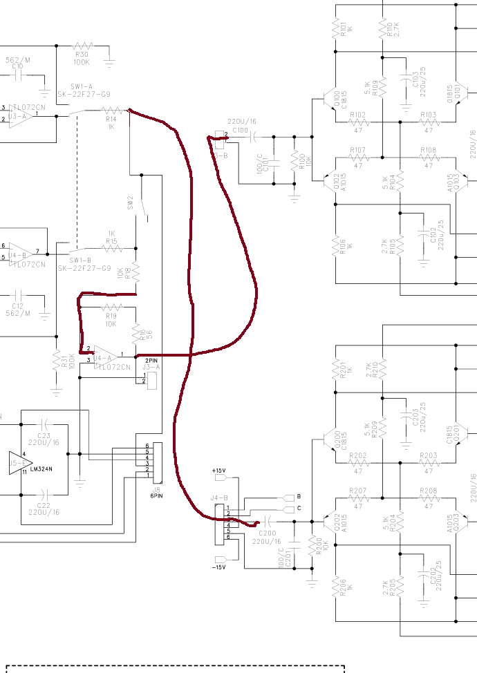 Уважаемые! Разбираюсь со схемой своего усилителя Такой вопрос почему один канал идет напрямую а второй чрез ОУ?
