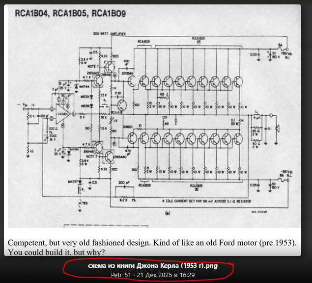 Желтым выделено слово, которое стоит над каждой такой схемой. Opinion - мнение. В данном случае интересуются мнением Керла. Красным я обвел индекс, который свидетельствует, по всей видимости, о том, что схема принадлежит разработчикам из фирмы RCA и когда-то ими публиковалась. То есть, Керл к ней никаким боком не относится. Поправьте меня, если ошибаюсь.