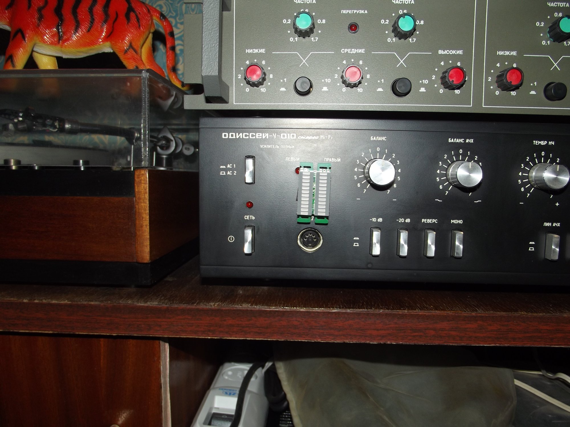 Прикупил очень редкий, ранний Одиссей 010, cделаный в декабре 1984го года, усилитель в отменном состоянии. Продавец утверждал, что данный усилитель был подарен его отцу, самим директором завода, в 1980х годах. Вариант без индикаторов перегрузки и другим стабилизатором, на двух КТ812В. По мелочам, есть и другие отличия. Нет одного электролита в УП(не разбирал,может в УП больше отличий), двойной диодный мост на КД202В, на основных конденсаторах БП нет резисторов, а сами конденсаторы не связаны, как это было в последующих версиях Одиссей 010. Силовые провода значительно толще, трансформатор очень тихий. В фонокорректоре не большие отличия, перед версией 86го года : + один трубчатый конденсатор и один резистор.. Есть клемма для заземления, которой нет у поздних версиях, сетевой провод выходи из под усилителя, радиаторы имеют вырезы для провода по середине, разъём для наушников "крестовой" СШ5. Возможно, некоторые номиналы компонентов отличаются, но не проверял, надо смотреть схему. С учётом того, что конденсаторы 81-84го года, и я их не менял, он работает! Басс такой же чёткий и хлёсткий, как у поздних Одиссей 010, но вот ВЧ более мягкие, не такие металлические, больше Бриг 001 первой версии напоминает. Возможно, после замены конденсаторов звучать он будет так же, как и поздние собратья. Менять конденсатороы всё же надо, есть характерный фон, свидетельствующий о высохших конденсаторах. Прям музейный экземпляр.