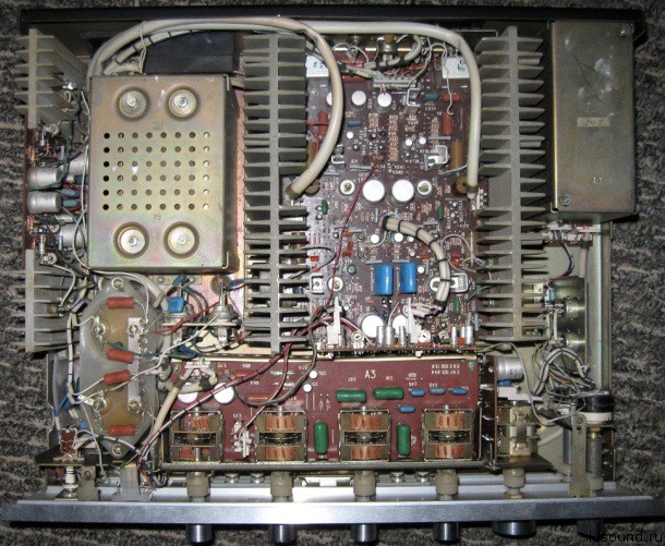 Под крышкой (лицом к нам) детали расположены следующим образом. Трансформатор в левой части, левее его – плата стабилизатора блока питания и его радиатор, ниже от трансформатора конденсаторы и диодный мост. По центру, внизу – плата предварительных усилителей, над ней платы усилителей мощности, по бокам которых расположены радиаторы выходных транзисторов. В дне усилителя есть крышка, которая открывается с внешней стороны и дает доступ к платам усилителей мощности со стороны пайки. Справа, вверху находятся платы для подключения магнитного звукоснимателя, которые закрыты металлическим кожухом. Ниже от них гнезда входов, регулятор громкости и переключатели входов.
