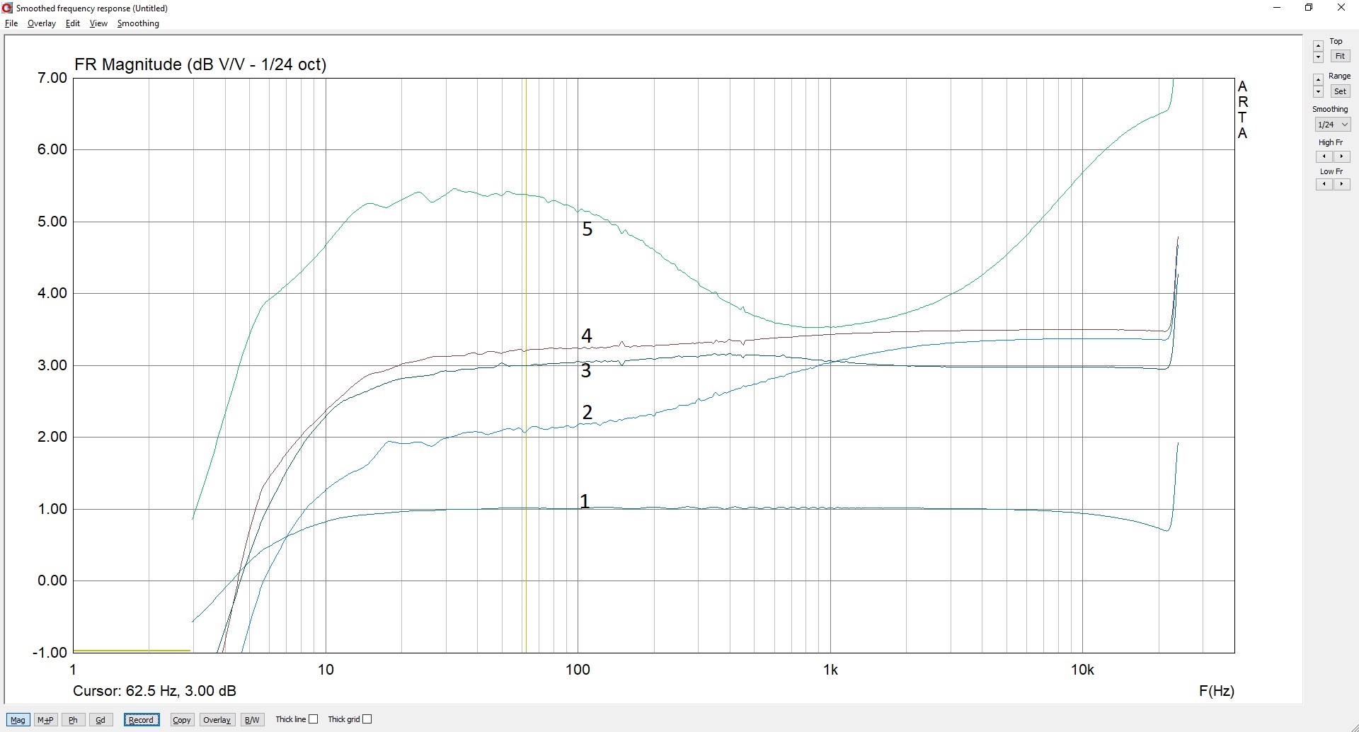 Было ощущение неровности ачх при установки всех регулировок посерёдке, потому прогнал через измериловку, получил такие графики