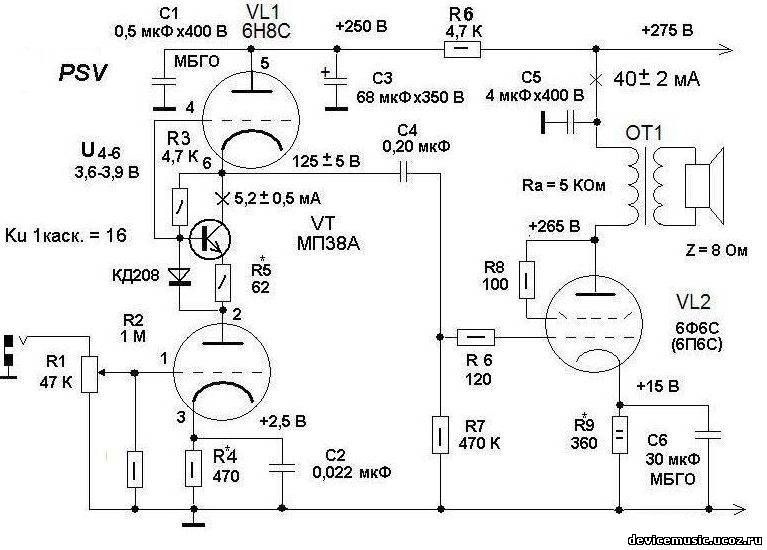Основной особенностью включения лампы предварительного каскада является параллельное включение двух триодов, находящихся внутри одного баллона лампы 6Н2П. Этим достигается уменьшение внутреннего сопротивления лампы, что влечет за собой улучшение нагрузочной способности и соотношение сигнал/шум.