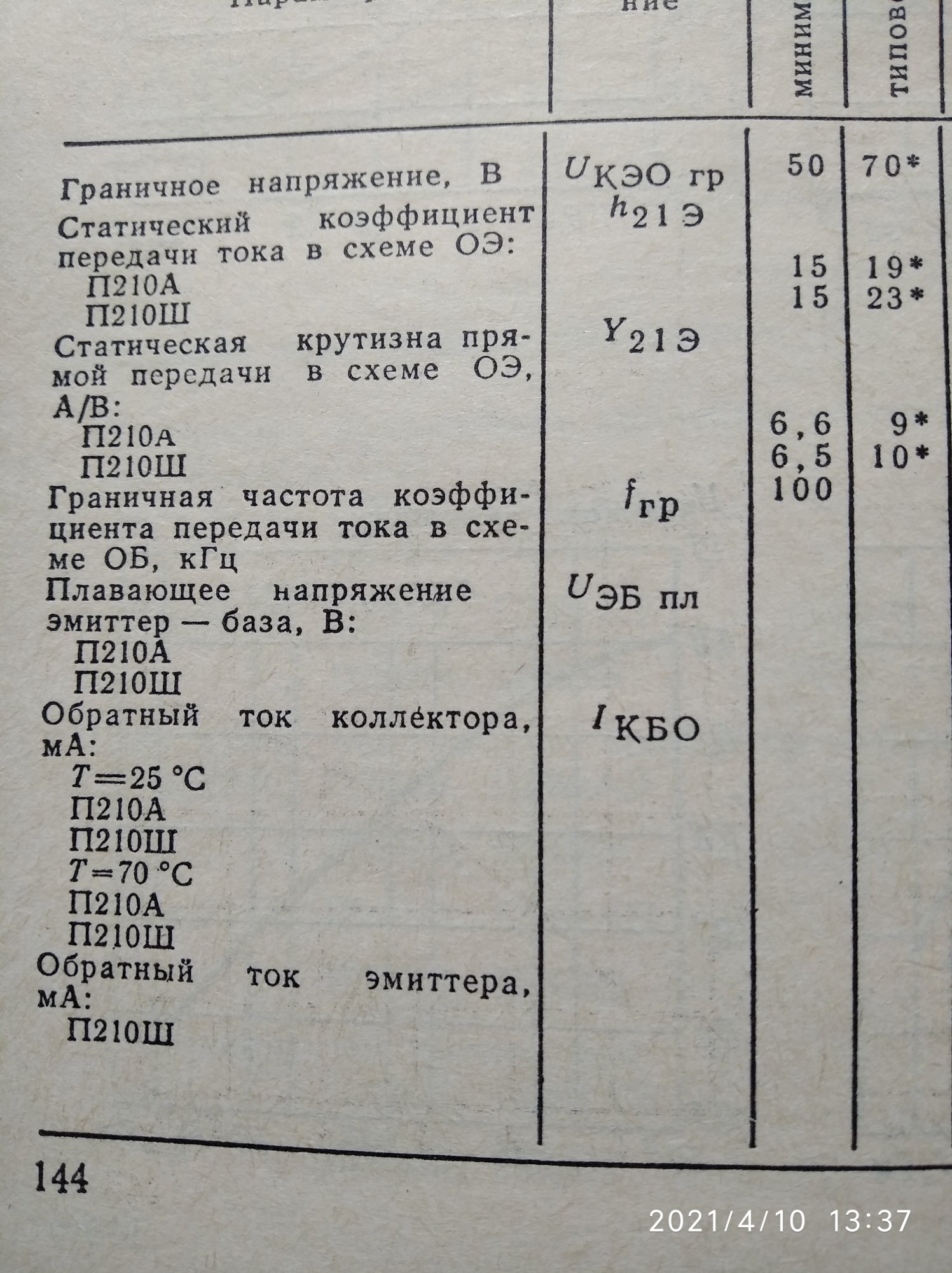 Iкбо - Обратный ток коллектора - ток через коллекторный переход при заданном обратном напряжении коллектор-база и разомкнутом выводе эмиттера: не более 8 мА;