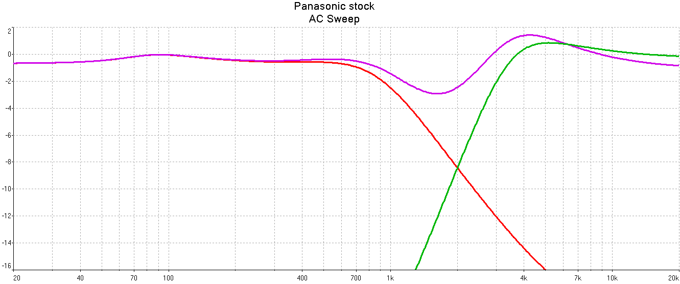 АЧХ стокового фильтра, 300 мкГн включено на землю. Активные сопротивления учтены, в том числе - повышенные у электролитов и потери в железе дросселя. Отдача НЧ и СЧ/ВЧ равна.