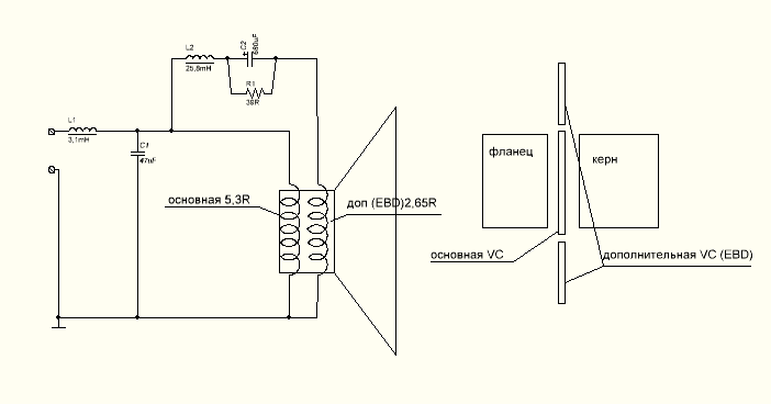 Катушки намотаны сразу в три провода (где-то, в какой-то из тем я упоминал этот динамик). Основная катушка из двух соединённых последовательно. А дополнительная из третьей части обмотки подключена к отдельному фильтру и накидывает овса при работе акустики.