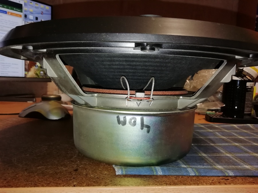 После подсыхания клея, динамик был усажен в корзину при помощи проставки