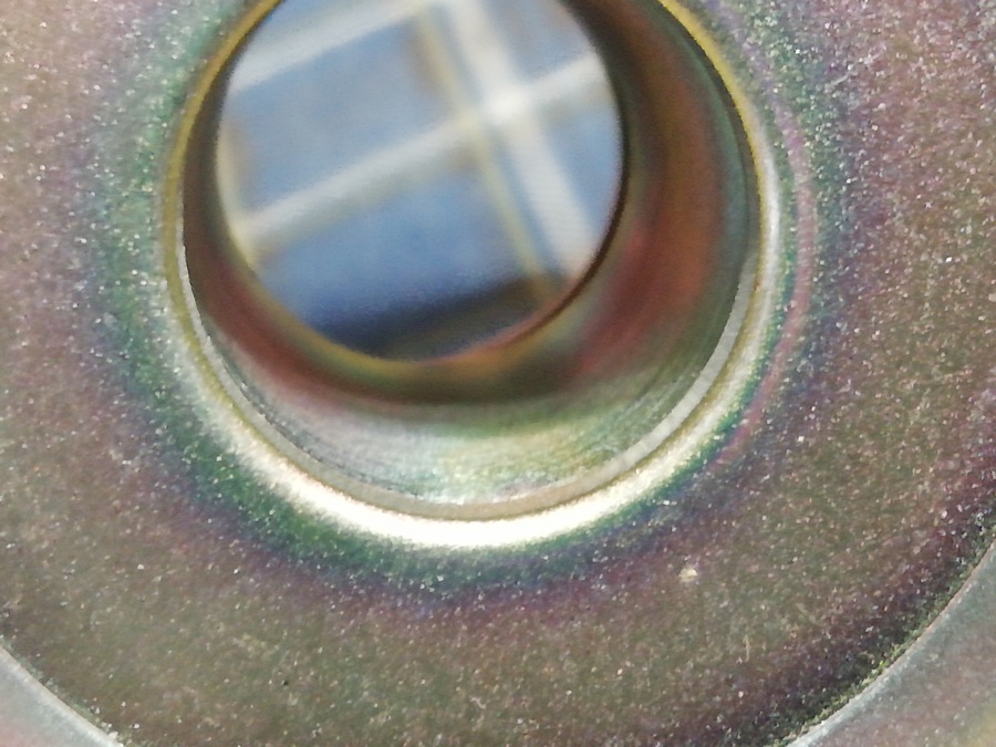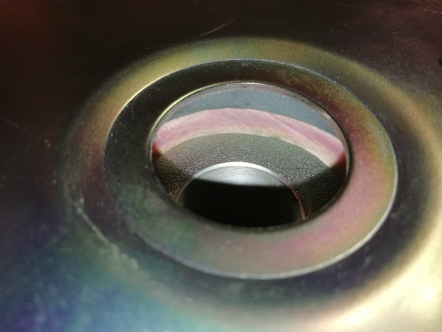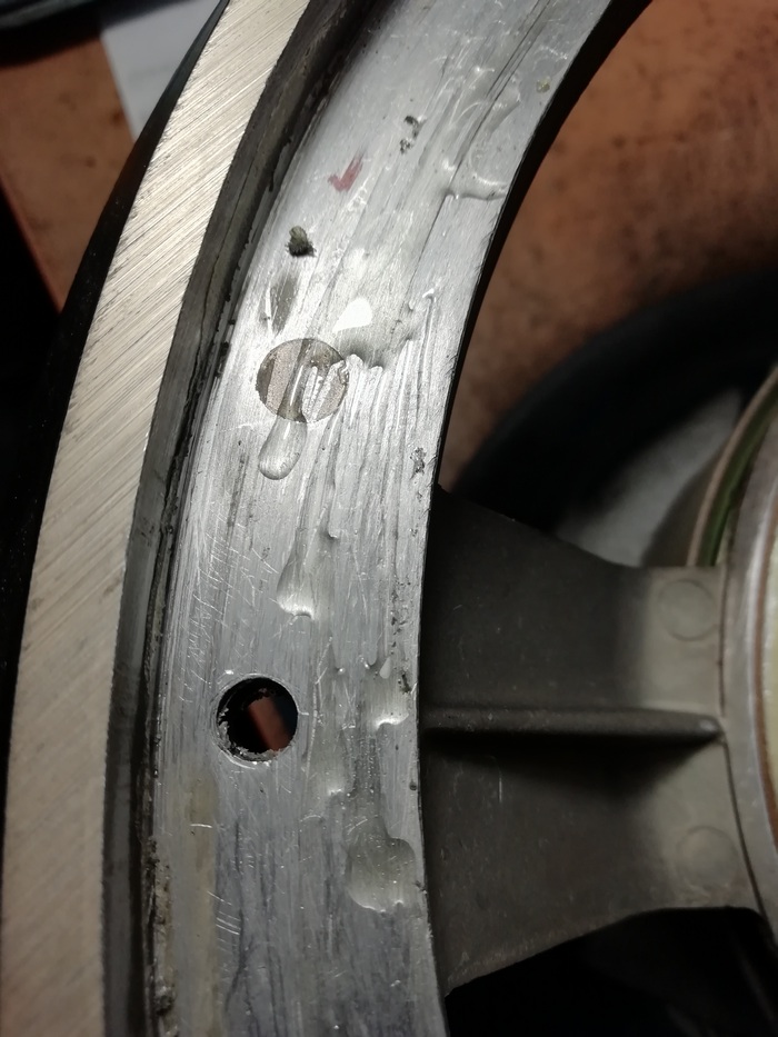Выступивший клей из под отбортовки колпака (совсем немного) удалил накручиванием клея на кончик зубочистки. Так как колпак отклеивался смесью спирт/ацетон, в некоторых местах осталась лёгкая белёсость. Которая была закрашена без последствий для общего вида краской для замши и нубука