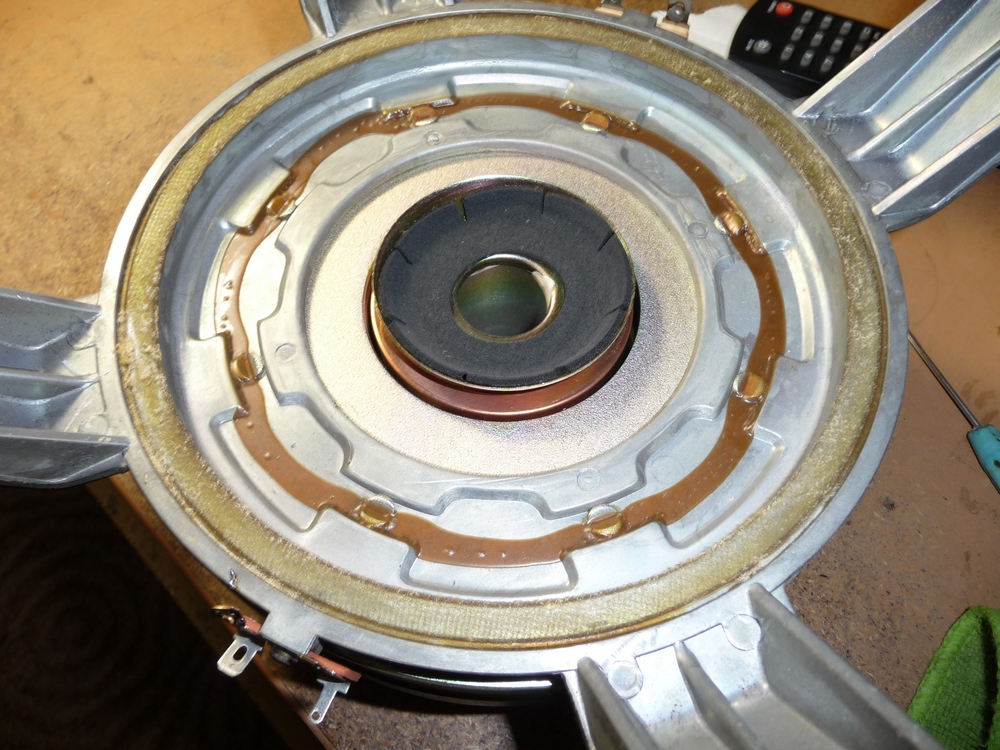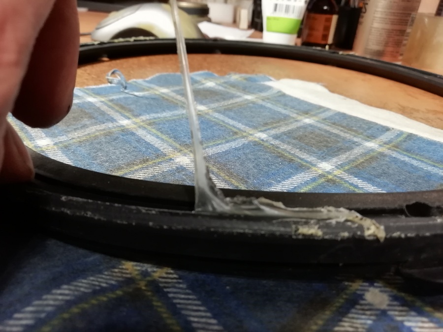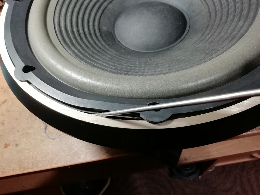 Так как у данного динамика ППУ подвес, разборку начал без применения каких-либо химикатов. Просто наковыривая отвёрткой последовательно, шаг за шагом отделяя декоративное кольцо из резины