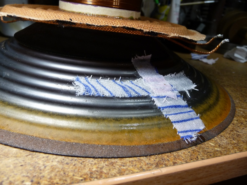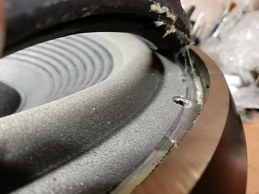 Скорее всего диффузор сломали, подвес развалился, заменили бумажным. Возможно при этом намудрили с катушкой. Но сборку сделали аккуратно.