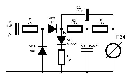 Применял оч удачную схему из книжки Конструкции советских и чешских радиолюбителей, автор Иржи Свобода. Там выпрямитель на диодах и нелинейный диодно-резисторный шунт стрелочника, оживляющий стрелку на малых уровнях и не приводящий к зашкалу на больших. осталась в убитом компе. https://www.radiolamps.ru/library/mrb_0955.djvu