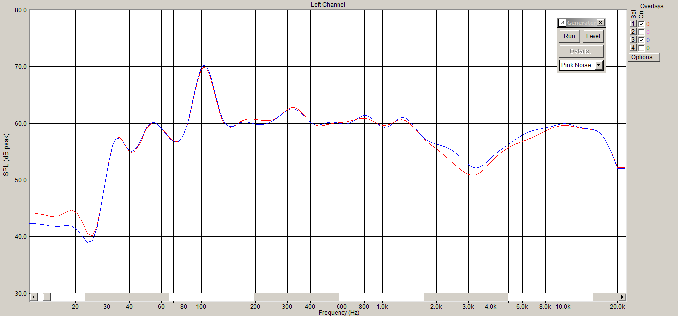 Сделал замеры. Микрофон 2 м от динамиков, примерно по оси, на высоте 1,5 м от пола. Результаты получил такие: