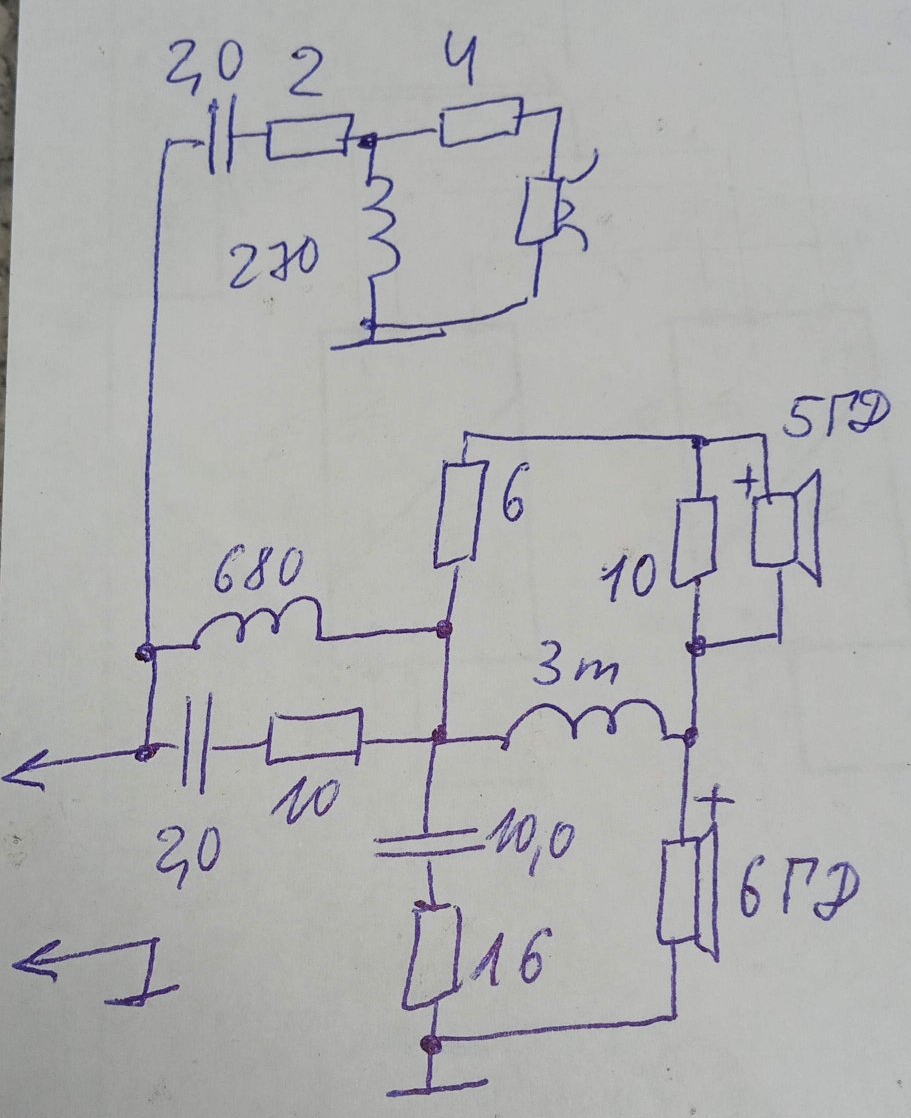 Пётр! Надеюсь, при измерениях в полосах динамики не выбрасывали, а заменяли резисторами? Но в данной схеме 6ГД не шунтирован ничем, и заменять его надо резистором с катушкой последовательно, хотя бы 270 мкГн.