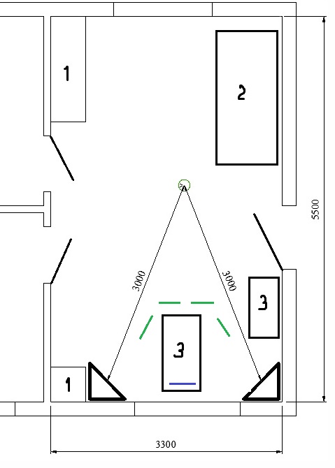 Вчера - щит стоял так, что от центра щита до длинной стены было 1,2 м, а до короткой стены - 0,5 м. Это было моно - один щит.