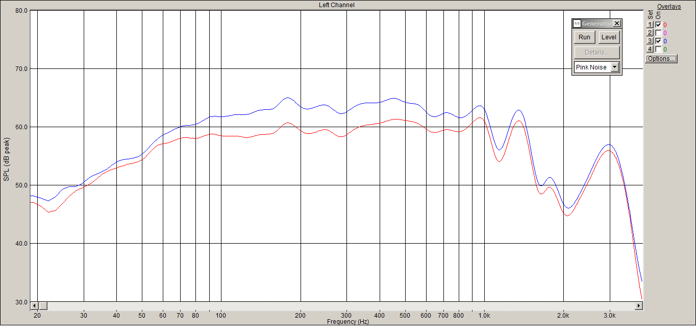 При выставленном чуть выше эквалайзером - полка почти от 40 Гц в упор динамику - заснял пару АЧХ (подключал и отключал SE УНЧ с СЧ/ВЧ.