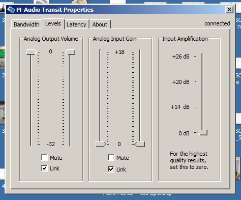 Путём проб, выставил "16 бит 48 кГц" - в трёх местах: в приложении USB Transit, в Виндовском "Воспроизведение" и в Виндовском "Запись". Получил такой результат (при уровне выходного сигнала 0 дБ и при максимально выкрученном переменнике на входе):