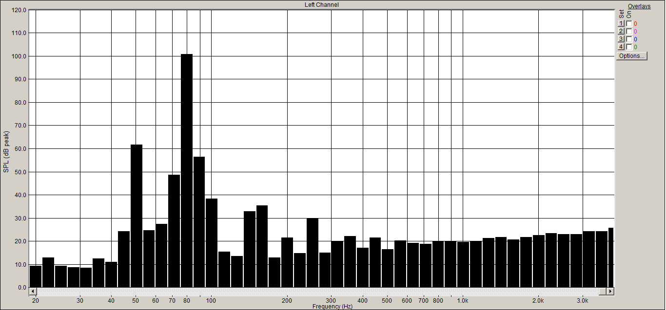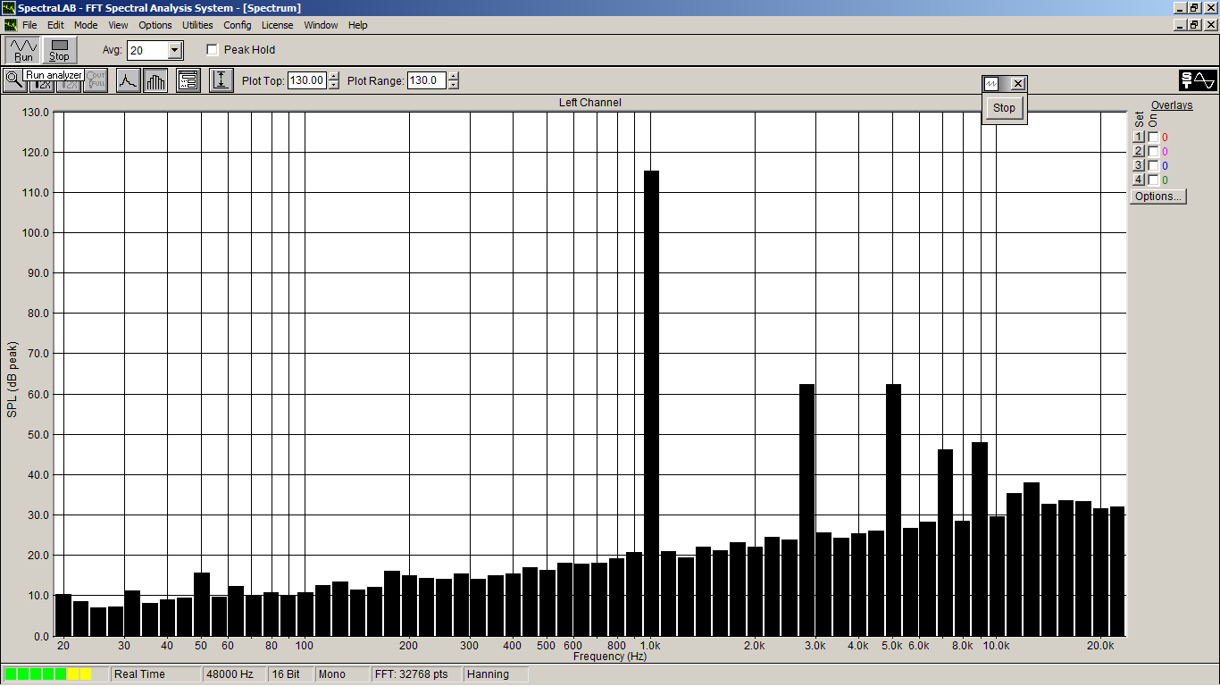 Поставил делитель на входе (переменник). Задал уровень громкости на выходе ноль - получил горку в районе 1 кГц, понизу. Посчитал перегруз. Уменьшал потихоньку уровень на выходе. При уровне -4 дБ - торчит только 1 кГц (и более высокие гармоники). Произвёл скриншот: уровень на выходе -4 дБ, переменник на входе - в максимальном положении: