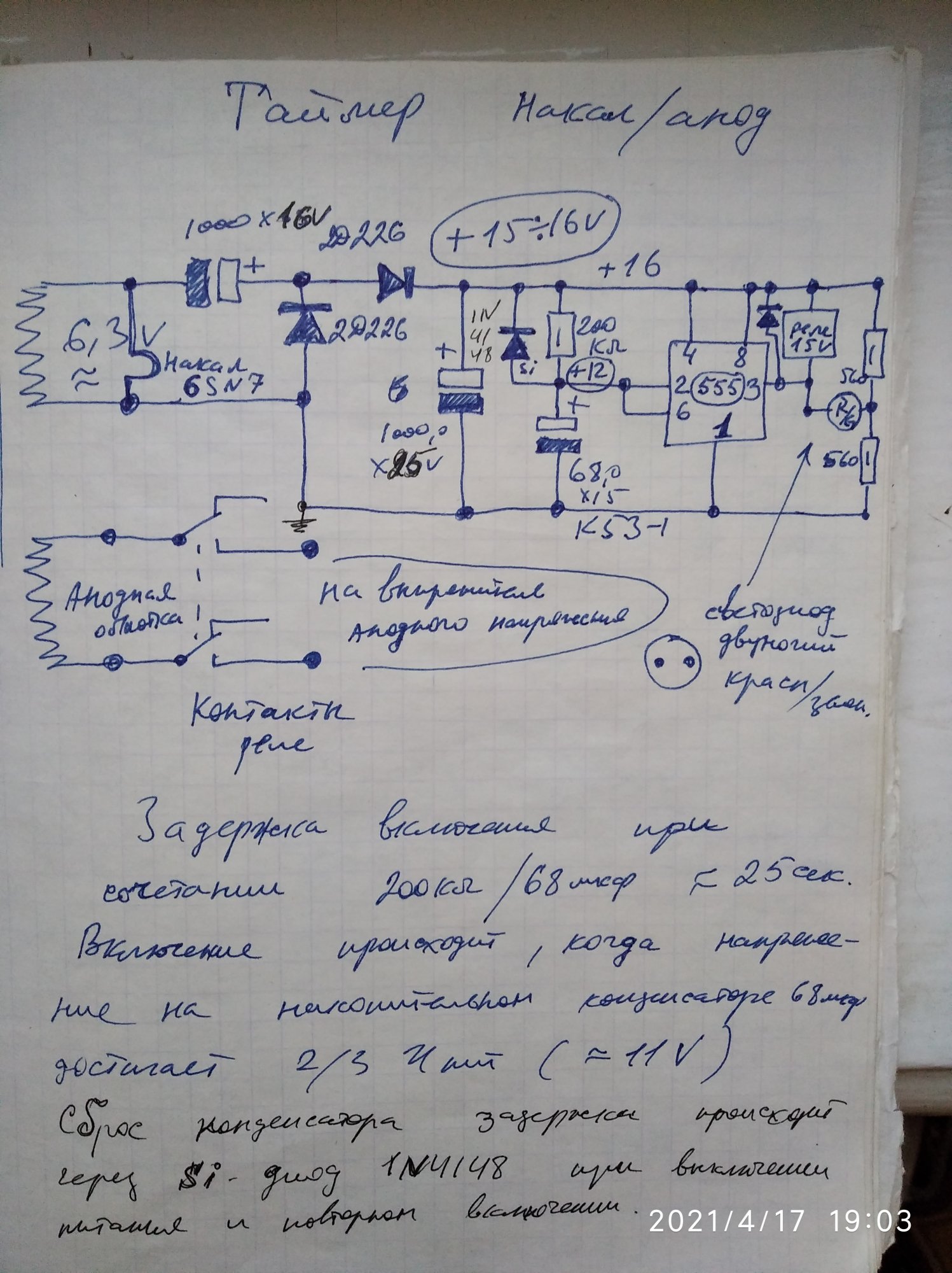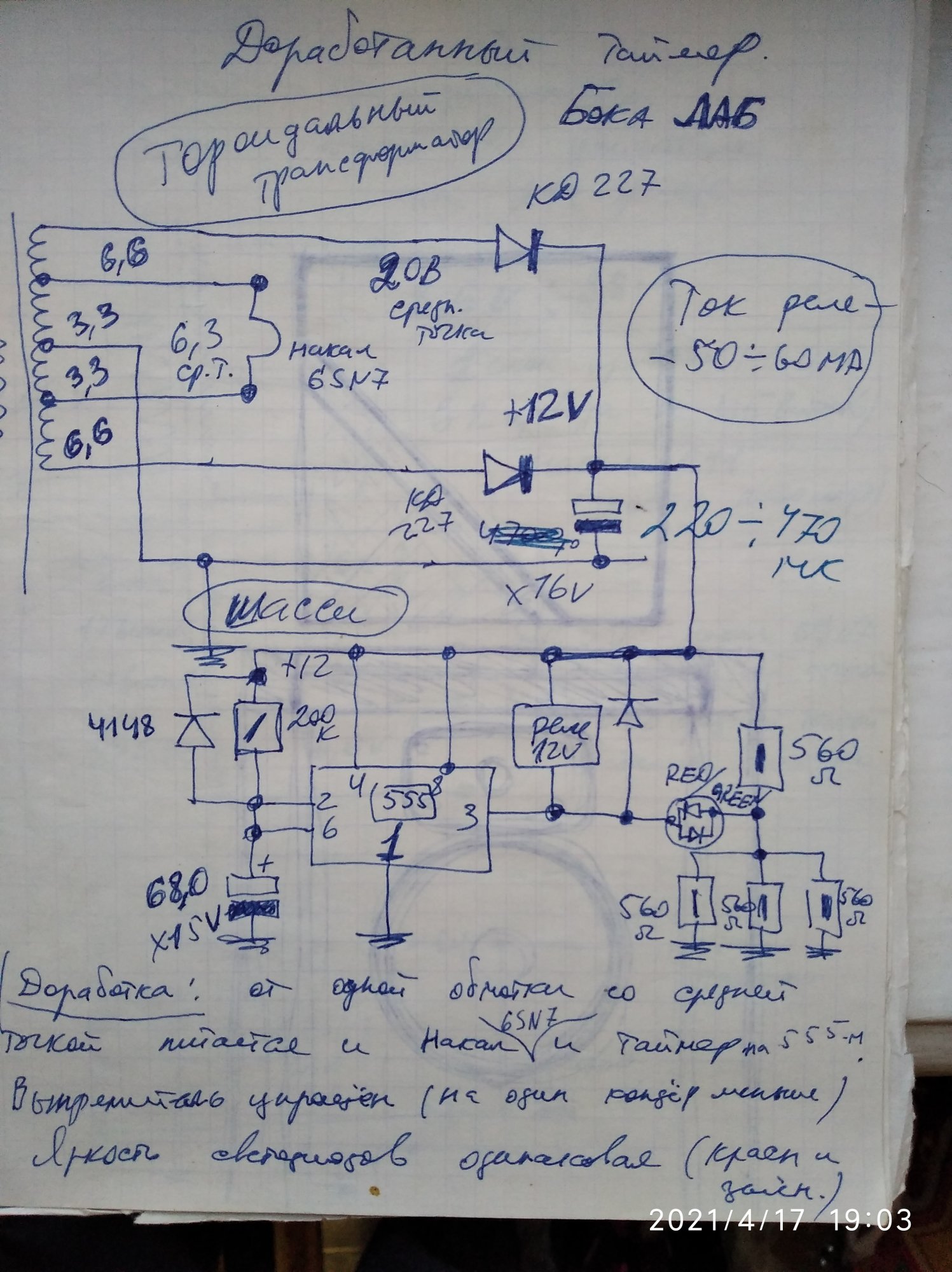 На таймере тл431 на 6с4с , тоже поспешил, там прямо от сети, конденсатор 2мкф*630в, диодный мост, Д815Д, транзюк кт814 с тл431, это не принципиально. Всё работает 6н8с-6с4с больше 10 лет, 6н8с-45 триоде больше 5 лет, хоть бы что.