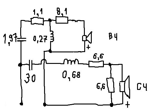 Итого. НЧ полосу пока не трогали. СЧ полосе в 2 раза увеличили входное сопротивление на НЧ и чуть - в остальной полосе, саму полосу протянули выше. В ВЧ полосе на частоте 15 кГц, было 1 мкФ+5 Ом=11Ом комплексное, стало 2мкФ+8 Ом=9 Ом комплексное, полосу сузили. Харэ.