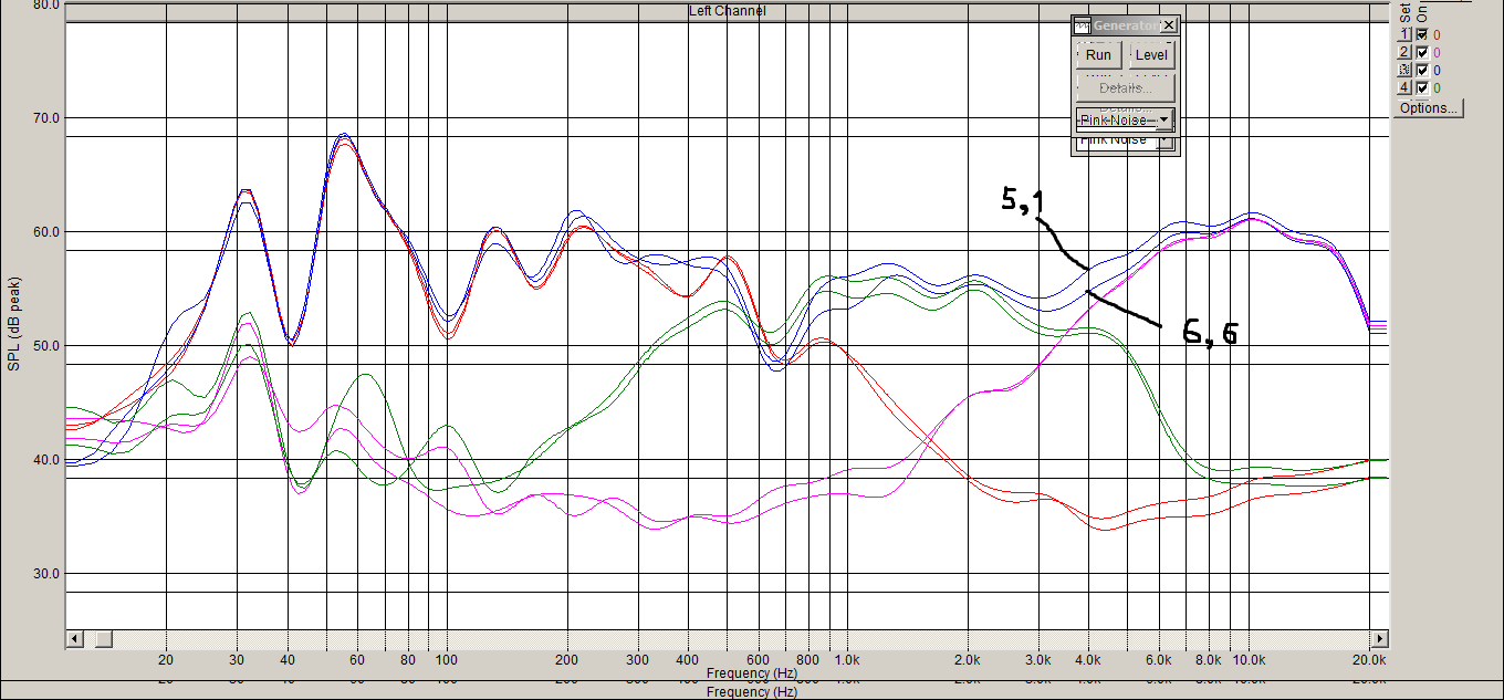 Разница - на грани точности измерения. Если можете наложить графики СЧ полосы с верхней точки измерения с 6,6 и и 5,1 Ом - покажите. Мне последний вариант нравится больше)) Надеюсь, Вы микрофон при изменении номиналов фильтра не двигаете? Мне кажется. полка мидбаса гульнула на -1,5дБ...
