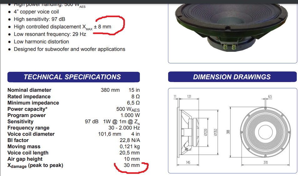 Смотрите параметры Бэймочки. 15", 8 мм линейного хода на сторону. Кому-кому, а ей болтать разрешено даже в присутствии королевы. Раньше она не пользовалась привилегией: стояла в углу и гоняла стоячие волны. Пусть поболтает теперь.