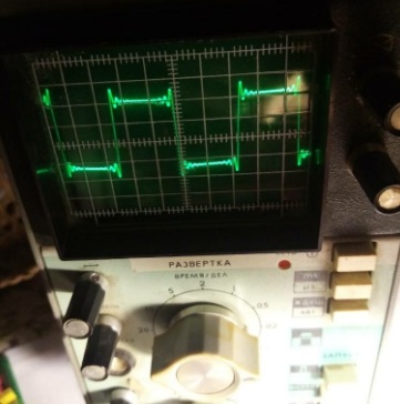 затем - ничего не меняя, переместил щупы осциллографа на сигнал с землёх входного сигнала на входе этой платы мощника ИМС. И снова сфотографировал экран осциллографа:
