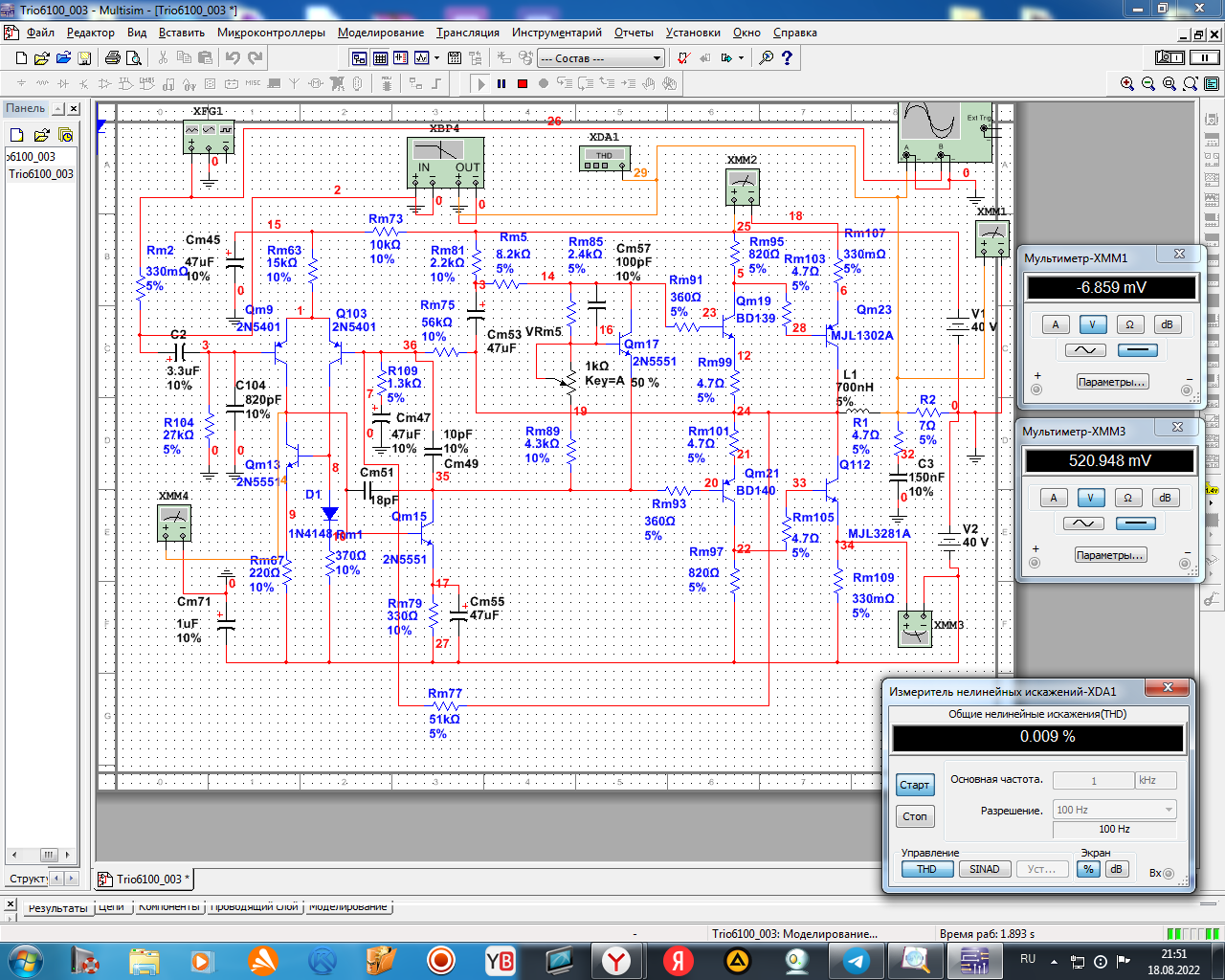 Вот взял моделько худа на полевиках и вв-шника. Чтоб немного уравнять условия у Худа(чтоб не вылетал из класса А) размах на выходе 4 вольта нагрузка 8ом, ток покоя - 1.1ампер. Транзисторы рассеивают в покое по 16 ватт на брата.(питание 27 вольт)